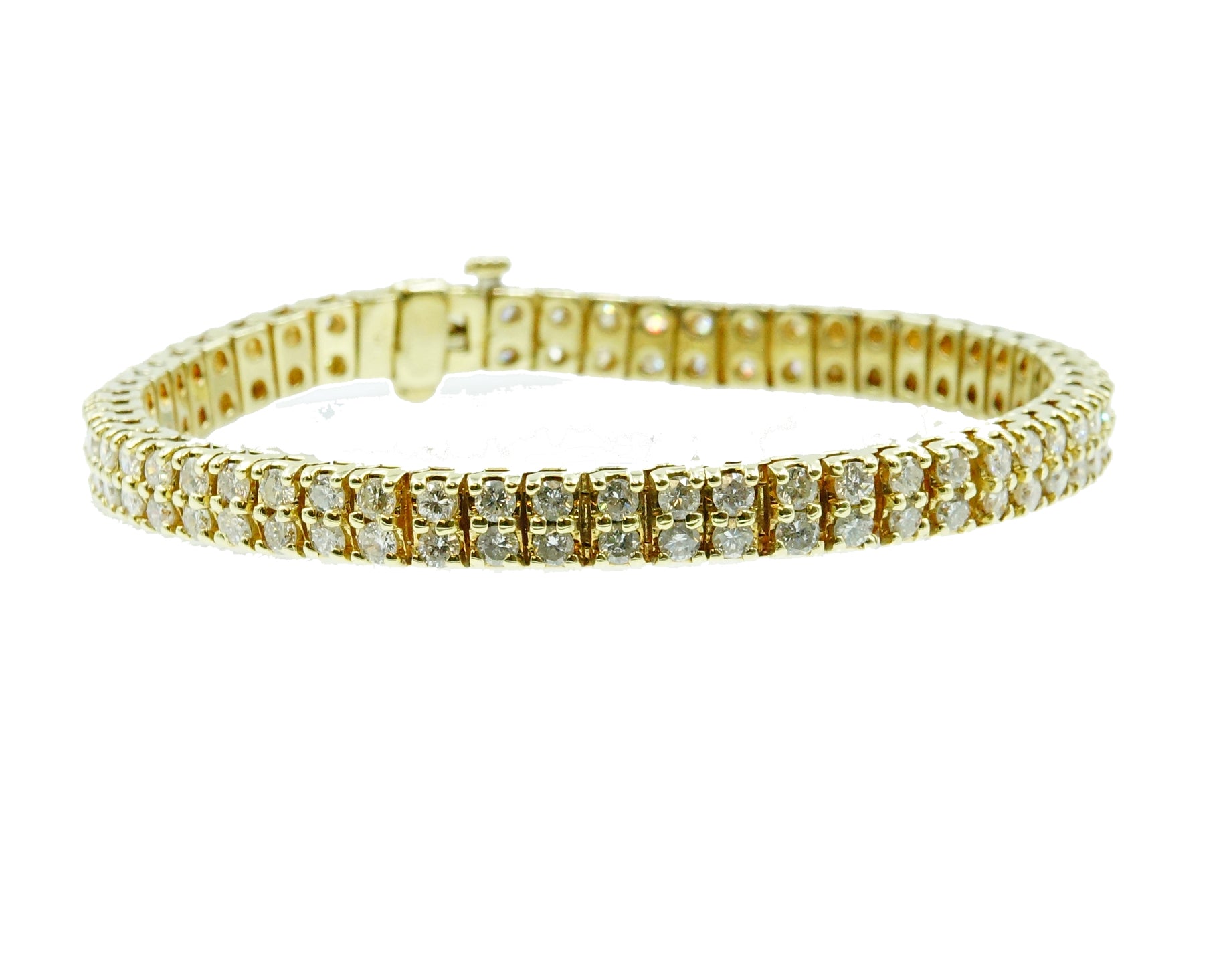 14 karat yellow gold tennis bracelet containing 5.50 carats of round brilliant diamonds with H-I in color and SI in clarity.