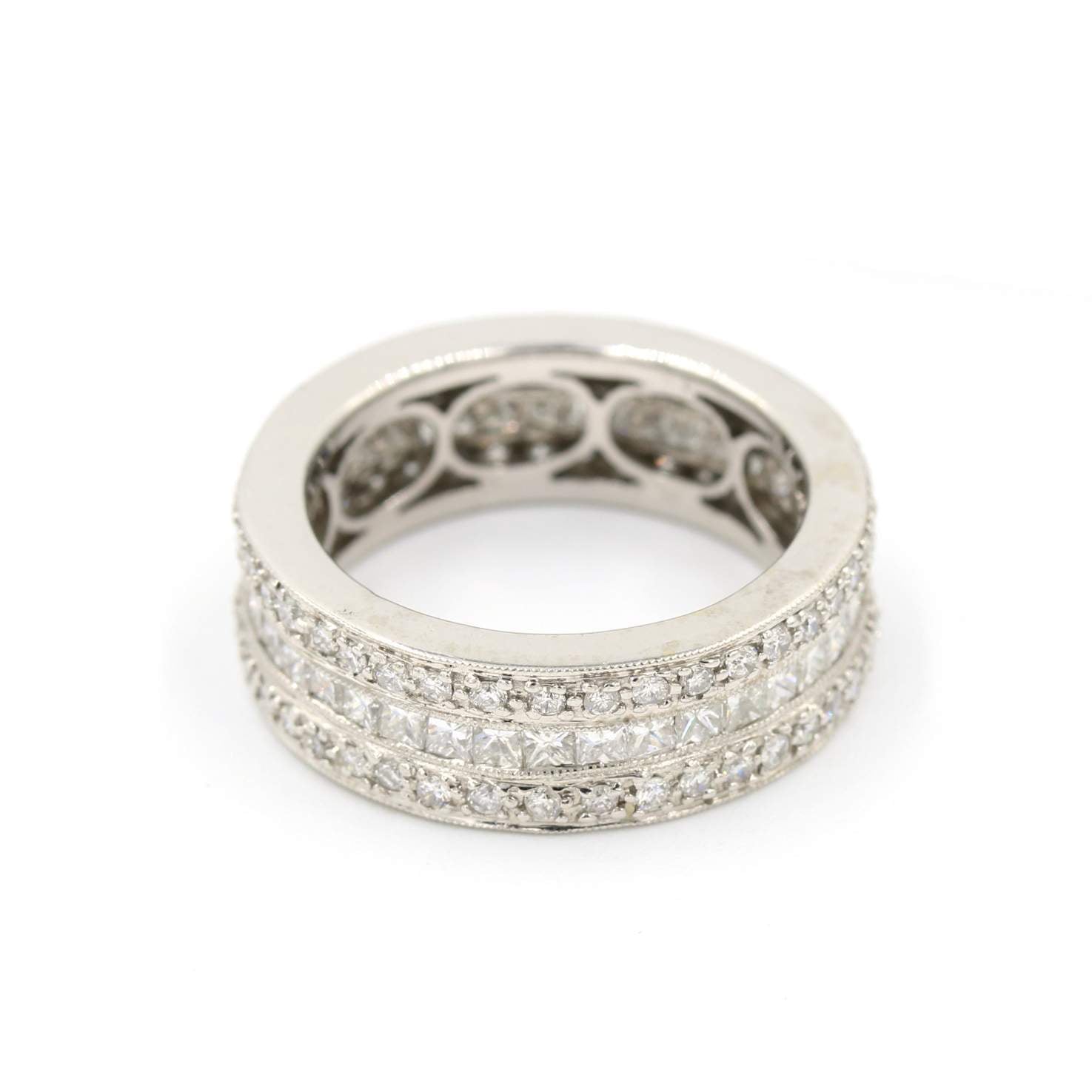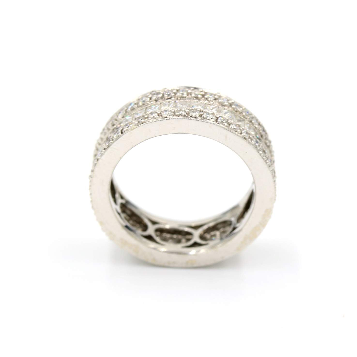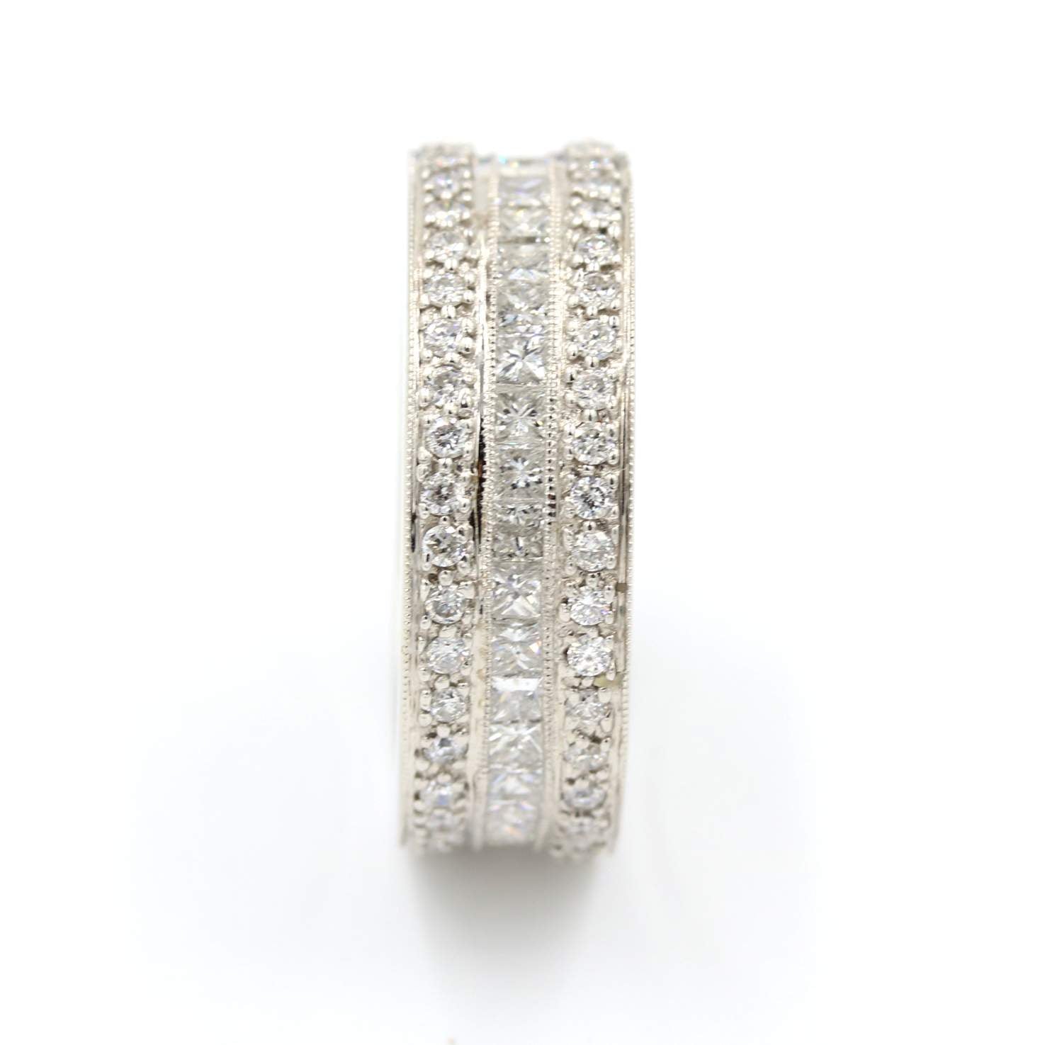 18 karat white gold triple row eternity band containing 2.25 carat total of round and princess cut diamonds with H in color and SI in clarity.
