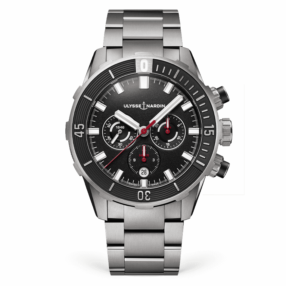 Wrist watch, Diver Chronograph Manufacture Cal. UN-150, 25 jewels. Self-winding ovement Titanium case, 44mm, Water-resistant : 300 m Black dial TTANIUM BRACELET