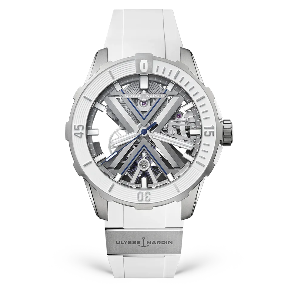 An unparalleled diving watch The Diver X Skeleton is a perfect blend of technical fine watchmaking and sports watches. Encased in titanium, its streamlined silhouette is cloaked in white. Audacity, technicality, power, and explosive energy characterise this model, which is utterly unique in the world of watchmaking.