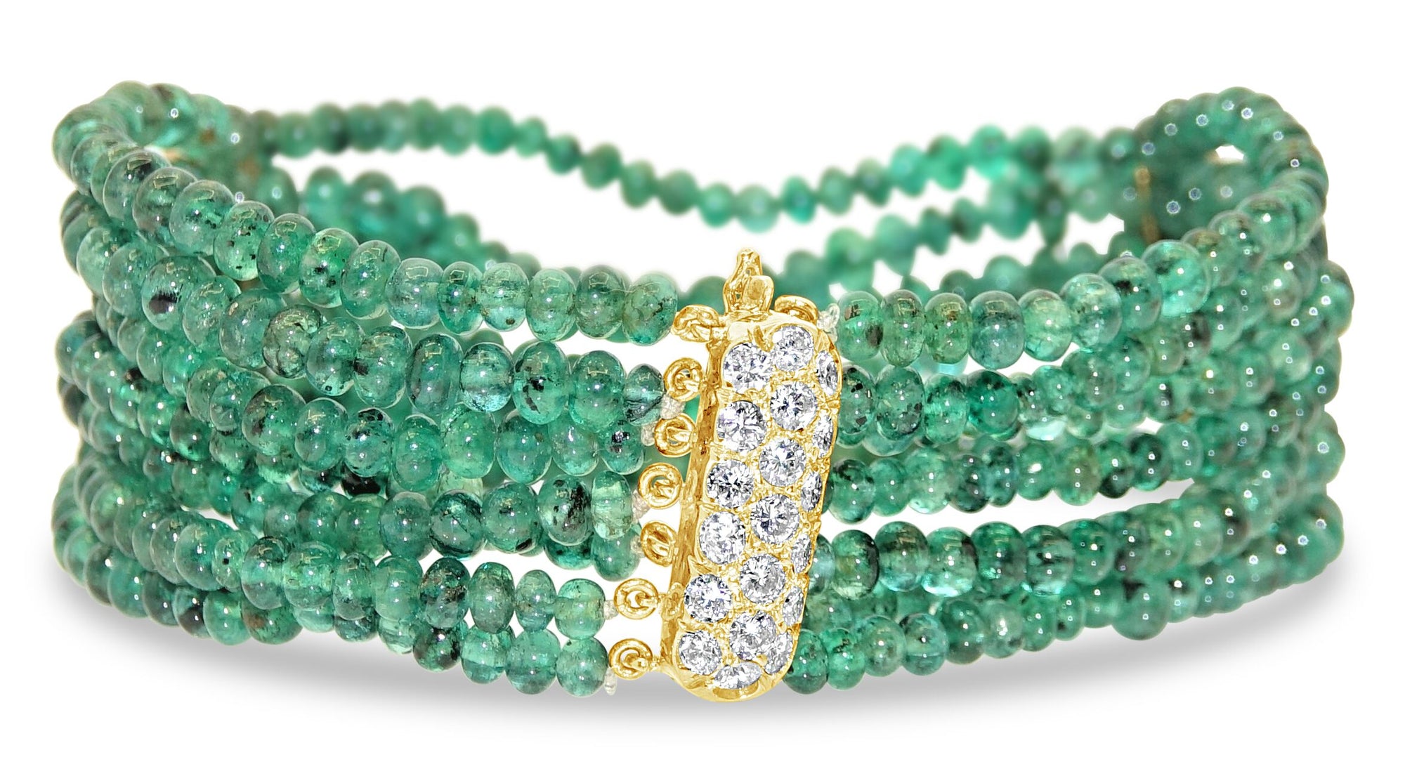 18 karat yellow gold emerald bracelet containing three diamond station.