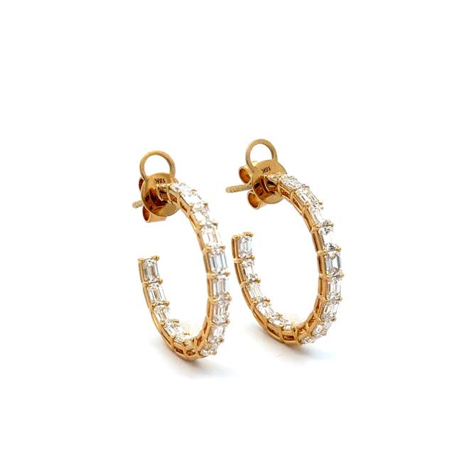 Crafted in 18 karat yellow gold, these hoops feature 4.35 carats of emerald cut diamonds with G/H color and VS clarity.