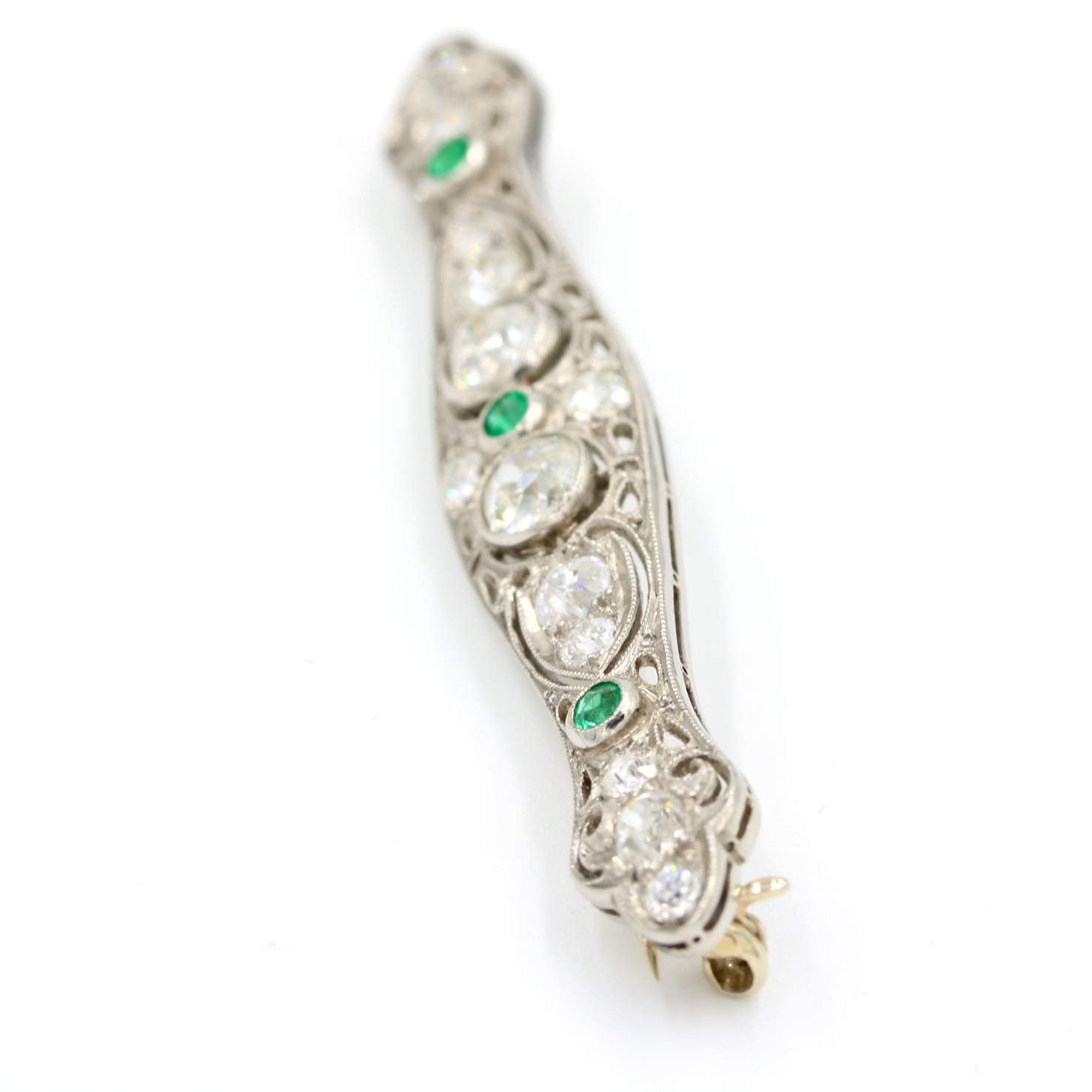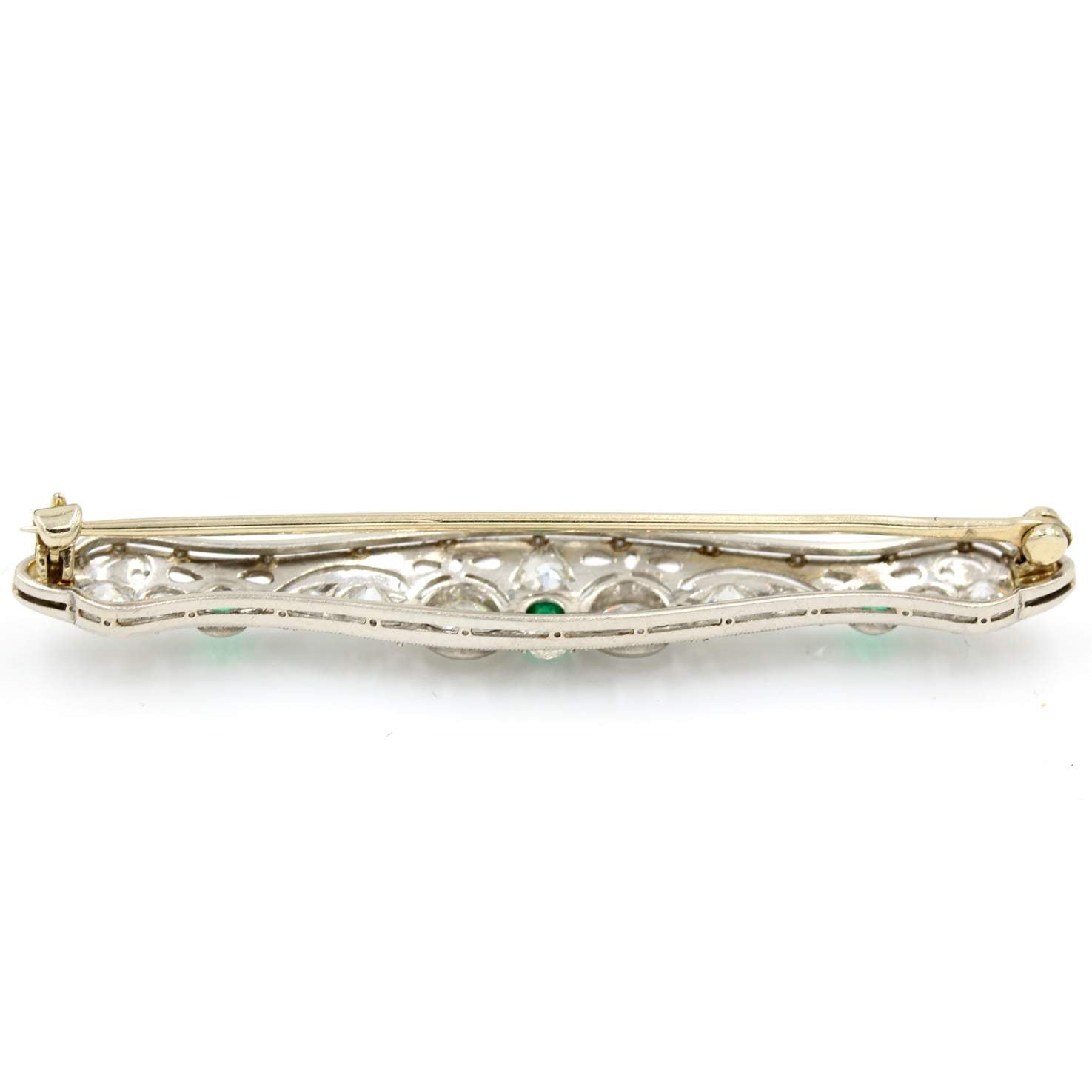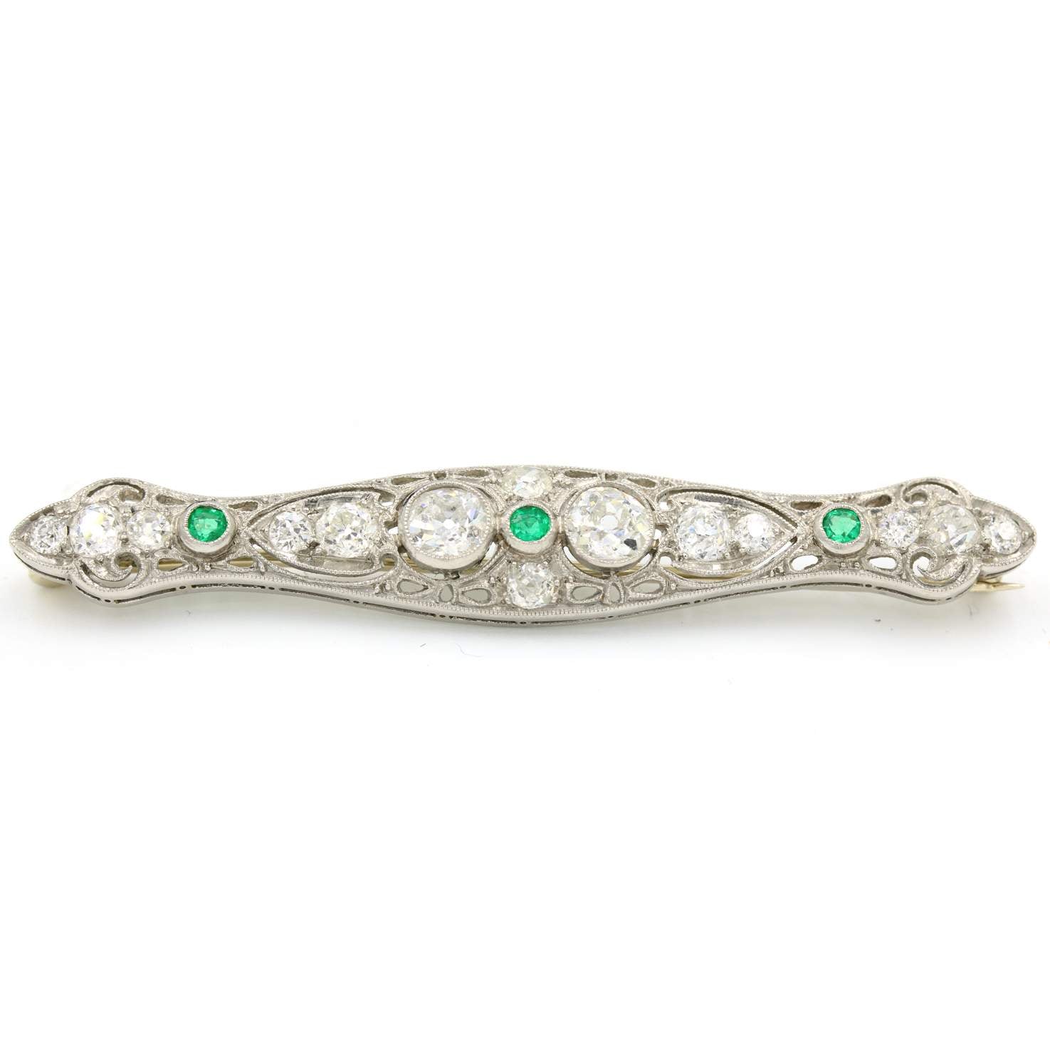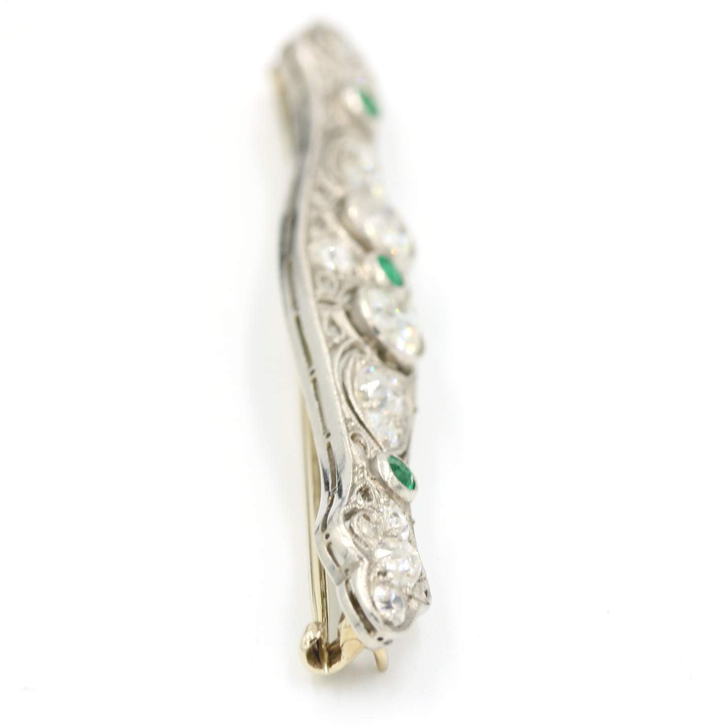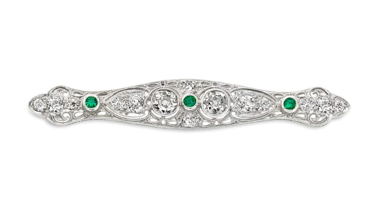 Platinum Vintage pin containing 2.00 carats of diamonds accented by 3 emeralds.