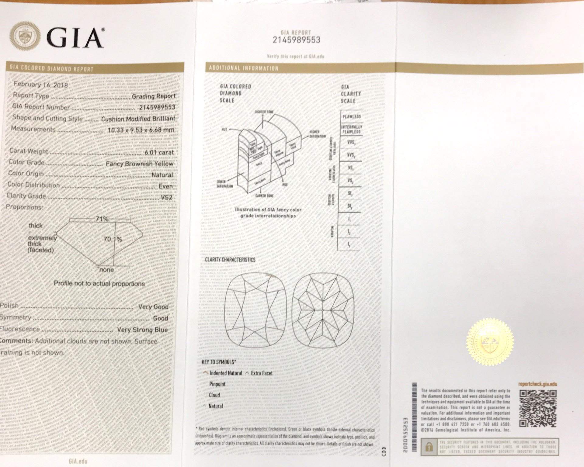 Beautiful 18K White Gold GIA Cushion Cut Natural Fancy Brownish Yellow 6.01Ct Diamond Halo Engagement Ring