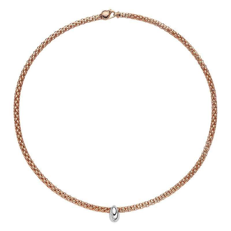 18 karat rose gold Fope Solo necklace containing 0.12 carat total of diamonds on a pave rondel.