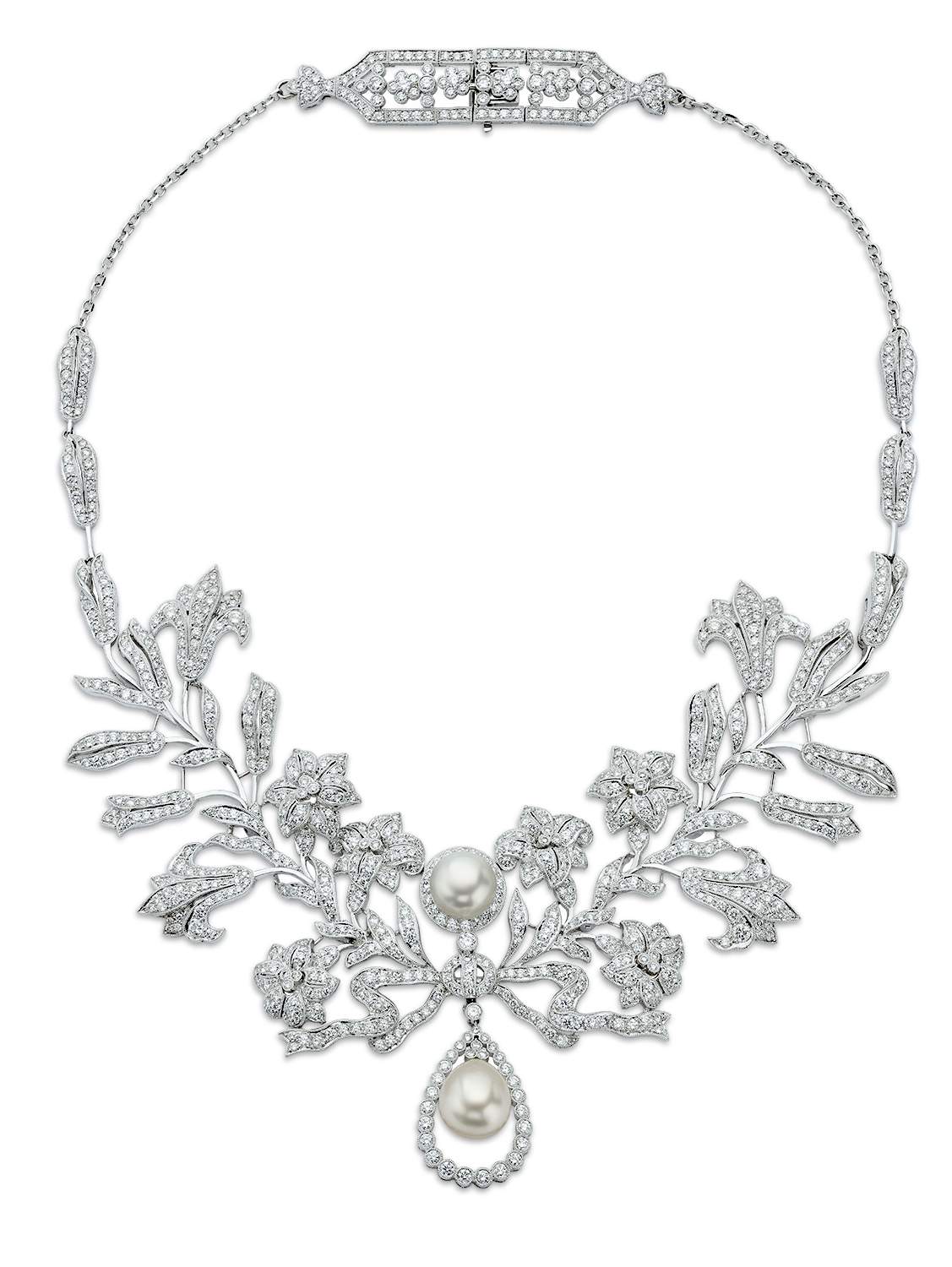 Stunning Fred Leighton Platinum Pearl Necklace Accented With 17.10 Carats Of Round Brilliant Cut Diamonds.