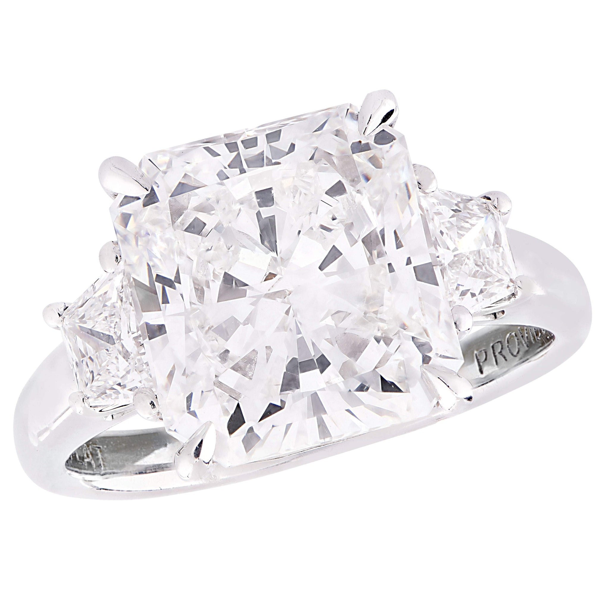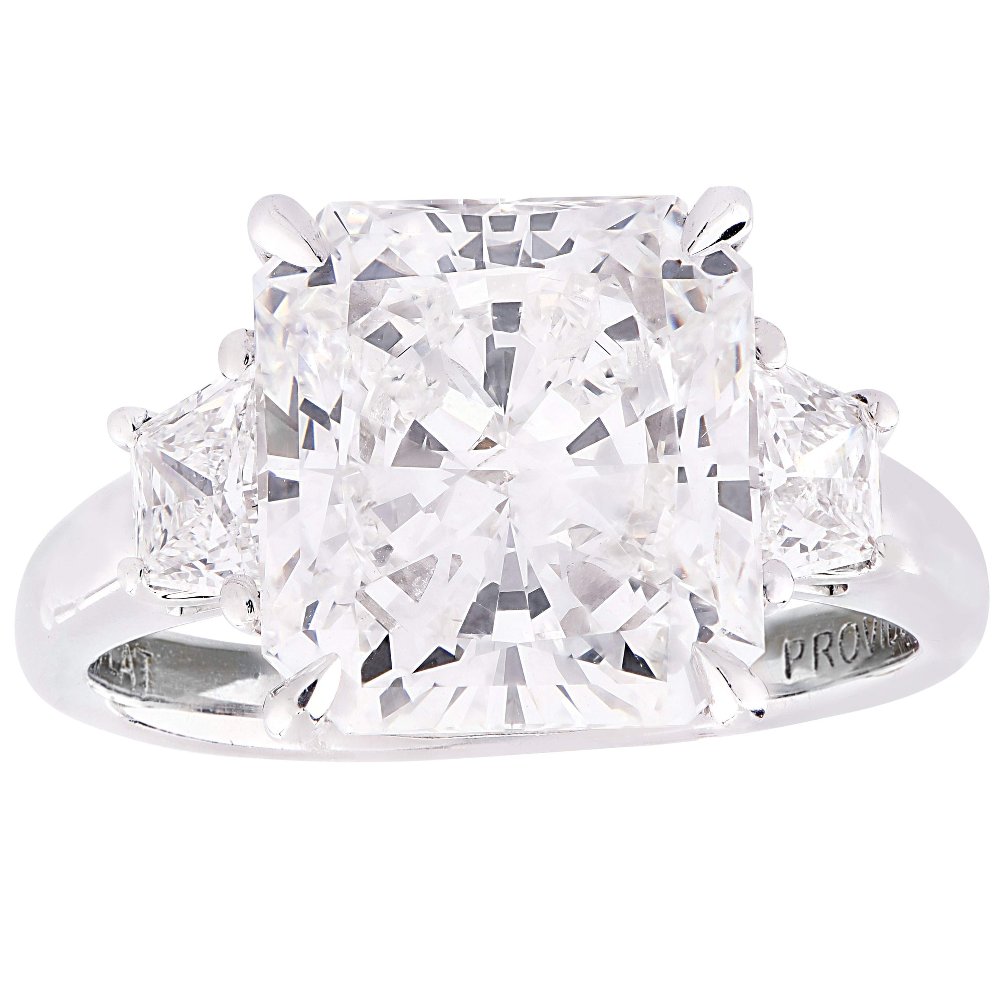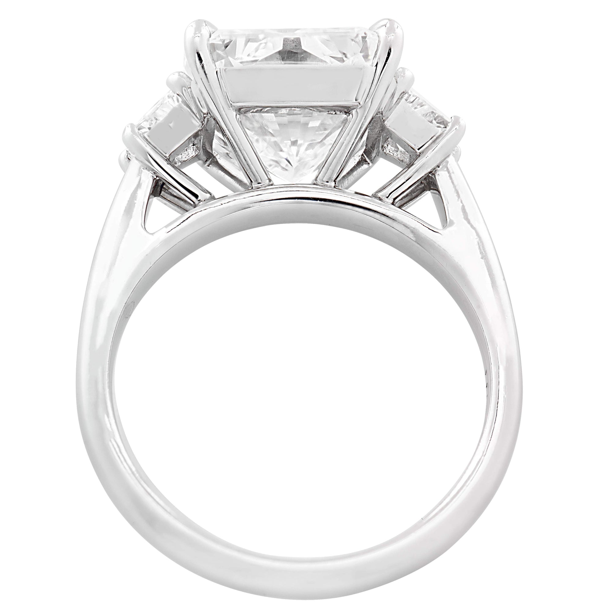 Delicately crafted in platinum, featuring a breathtaking GIA-certified 5.26-carat radiant-cut diamond with G color and SI1 clarity. Elegantly complemented by two trapezoid brilliant-cut diamonds totaling 0.51 carats, with G color and VS-SI clarity, this stunning piece exudes timeless sophistication. Currently a size 6, the ring can be seamlessly resized to fit any preference.