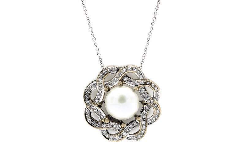Pendant features a Mabe pearl surrounded by 1.16 carats total weight of Diamonds set in 18K white gold on a 16" chain.