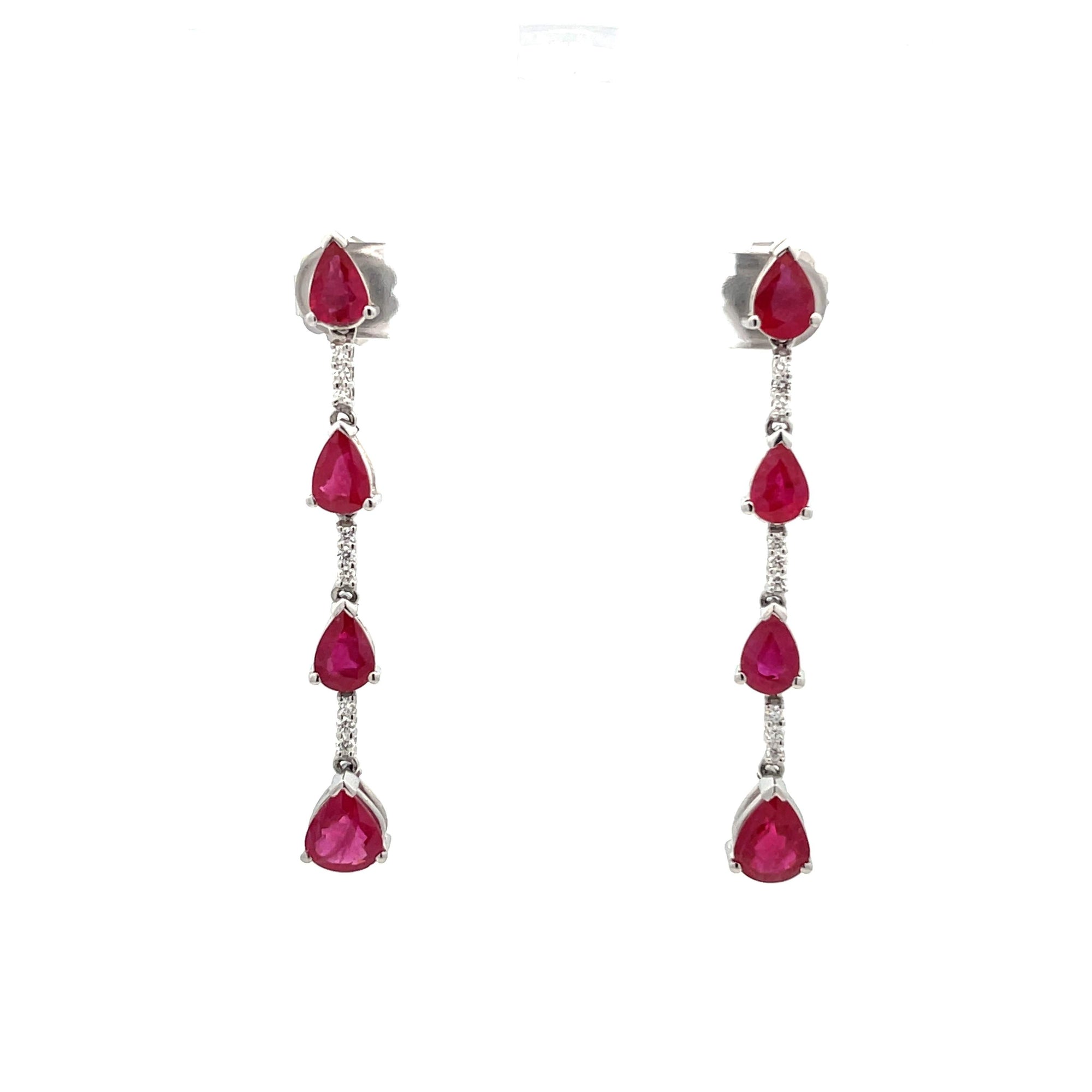 18 karat white gold Gregorio Dangle Earrings containing 8.98 carat total of pear shape rubies and 0.27 carat total of white diamonds.