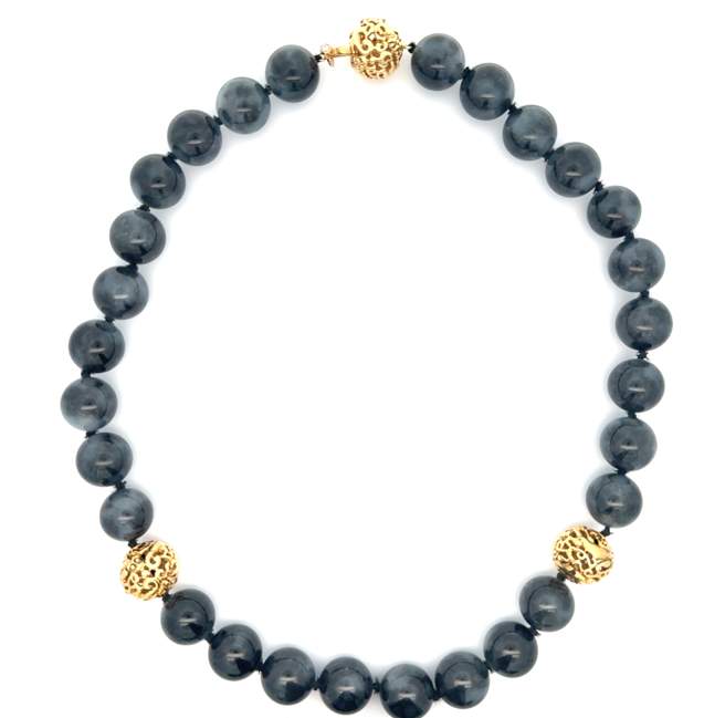 Necklace features 28, 14mm grey jade beads and three 18 karat yellow gold filagree beads accented with 0.03 carats of diamonds.