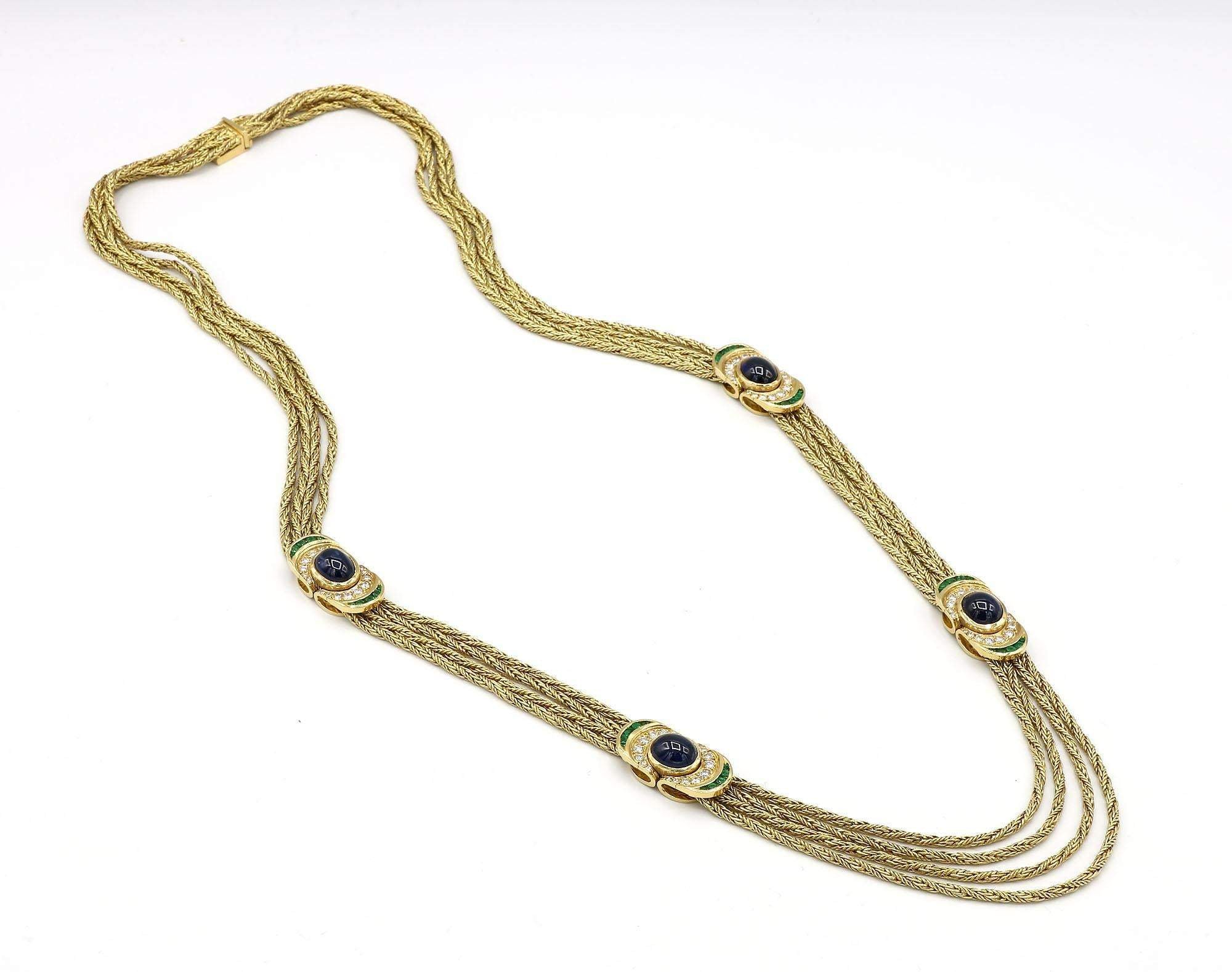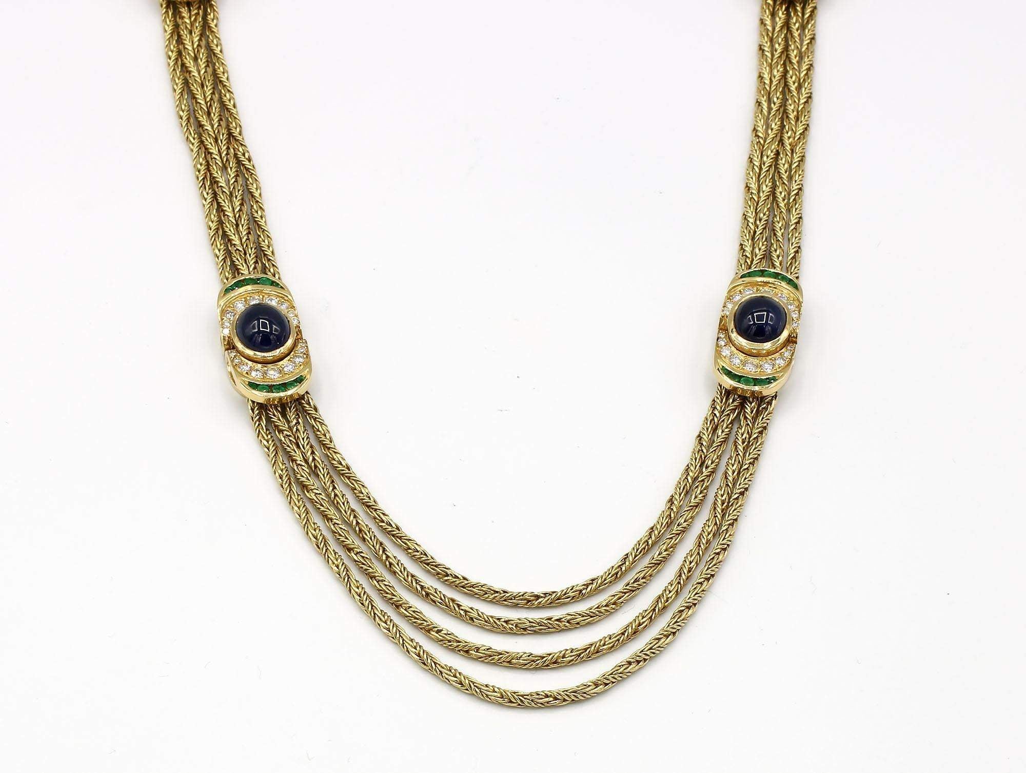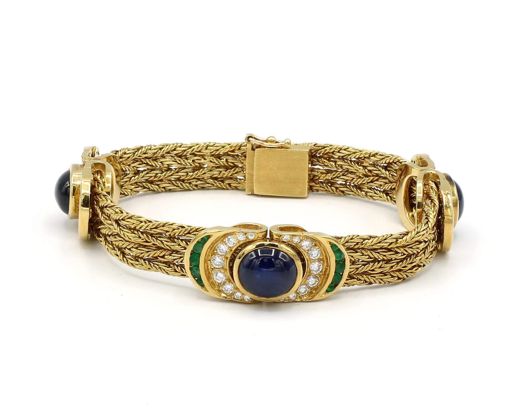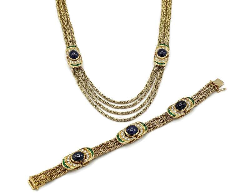Necklace and bracelet feature 2.46 carats total weight of diamonds, 20.70 carats total weight of sapphires and emerald accents set in 18K yellow gold.