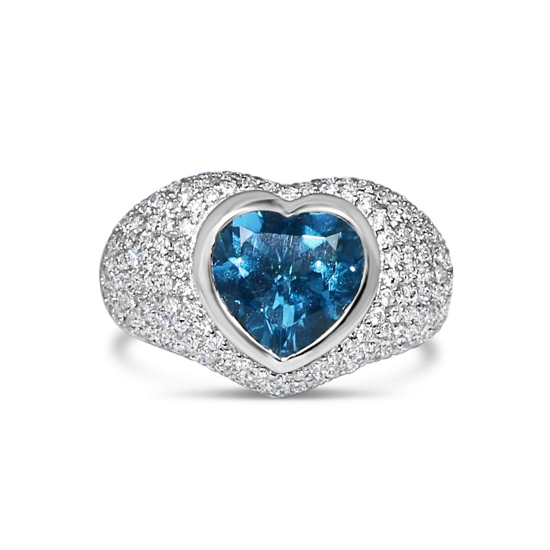 Ring features one 1.50 carat heart shaped Blue Topaz and pave set Diamonds in an 18K white gold setting.