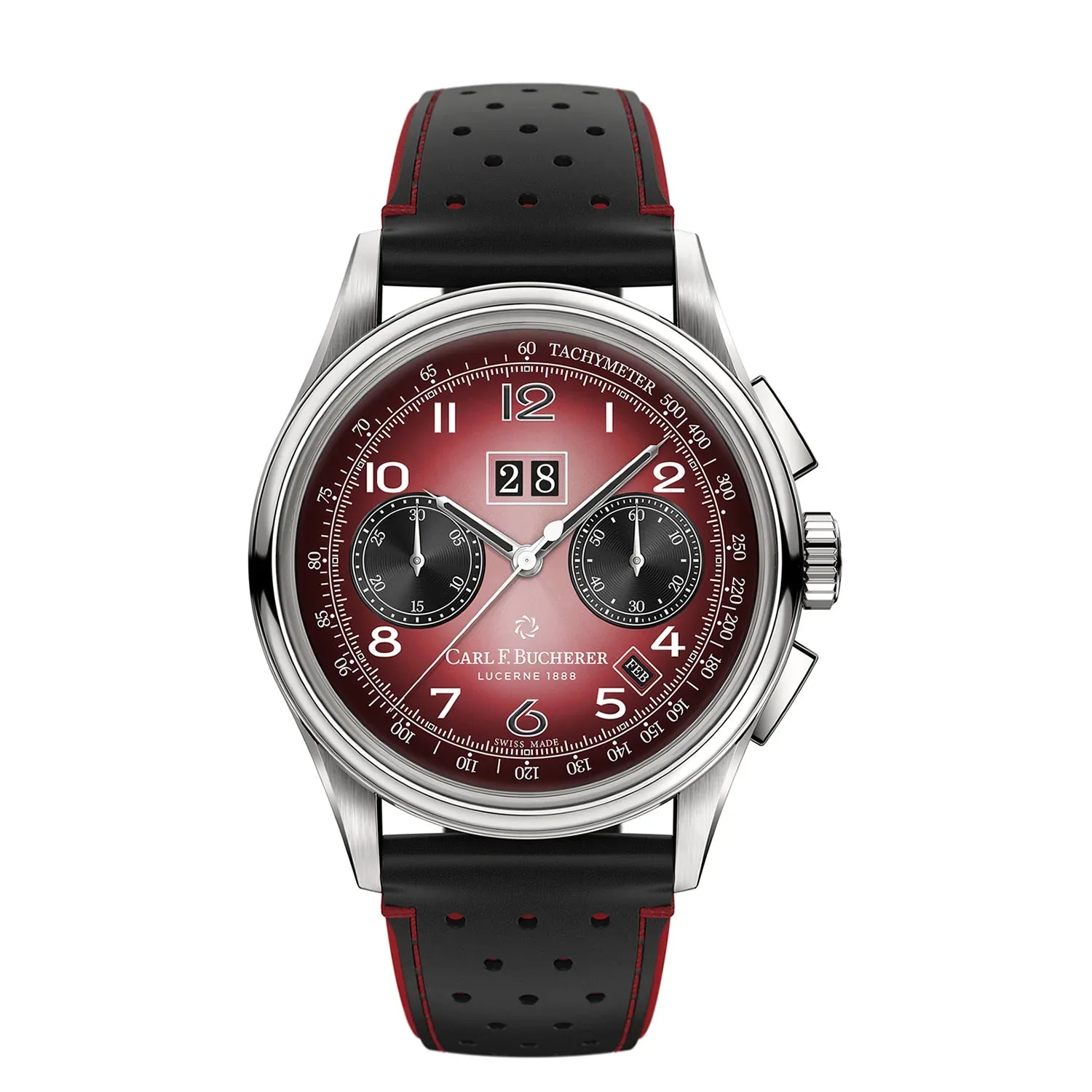 Stainless steel automatic with chronograph, annual calendar, big date, round, 30 atm, dial: red with black sub dials arabic, rubber strap- San Francisco Edition