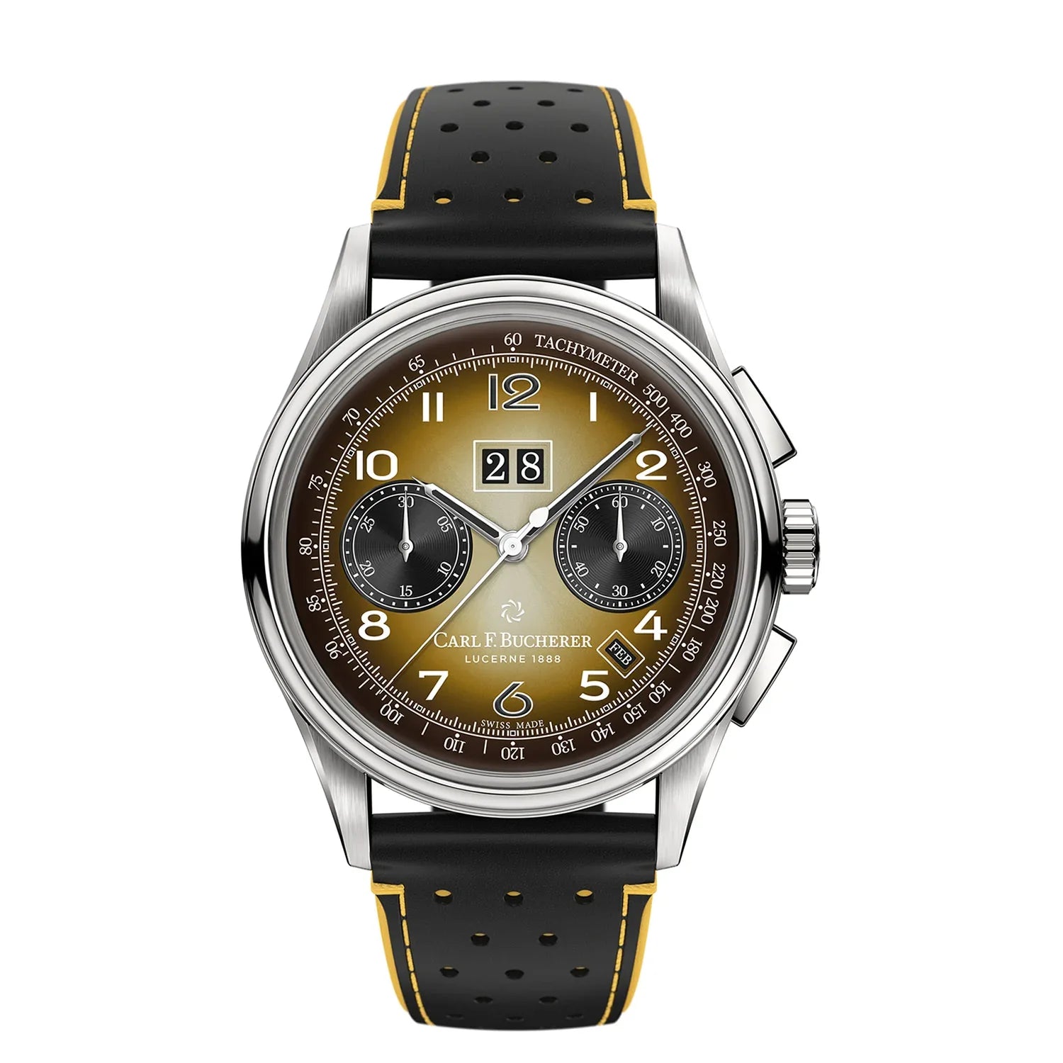 Stainless steel automatic with chronograph, annual calendar, big date, round, 30 atm, dial: yellow with black sub dials arabic, rubber strap- Las Vegas Edition