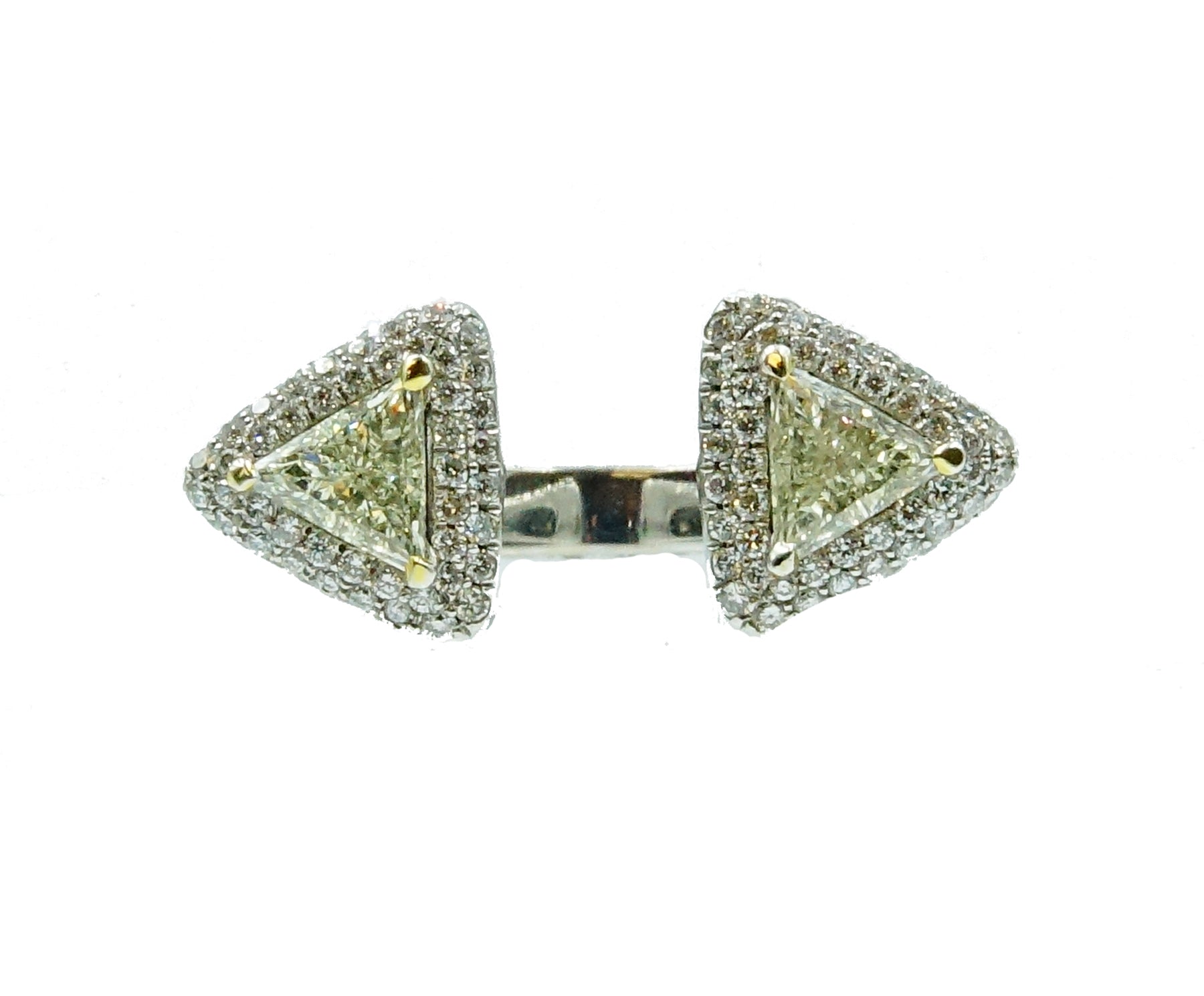 18 karat white gold Inbar ring containing 0.76 carats of 2 light yellow diamonds with 0.80 carats of white diamonds.