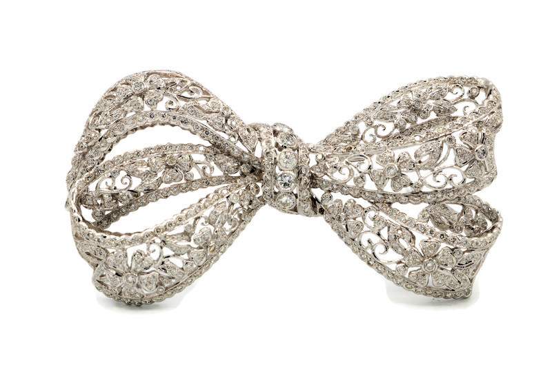 Brooch features 4.75 carats total weight of diamonds, set in an intricate 18K white gold design of flowers and leaves on a ribbon tied in a bow.