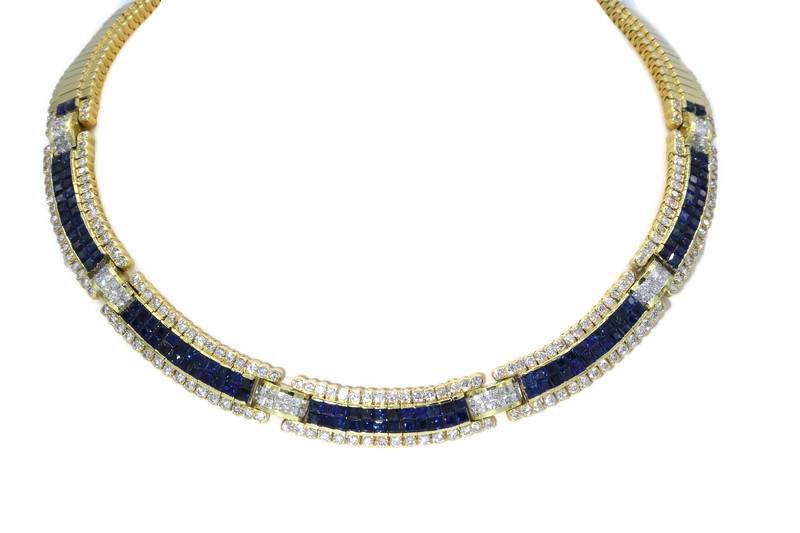 Necklace features princess cut, invisible set sapphires and 7.25 carats total weight of diamonds set in 18K yellow gold.