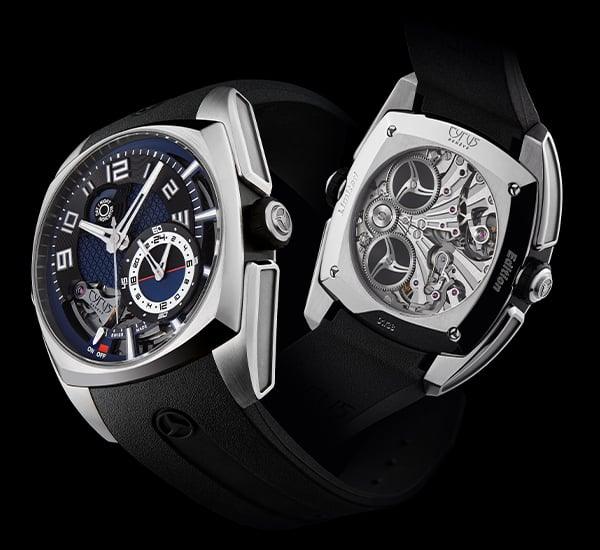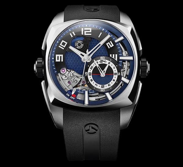 46 mm steel case - 3D dial in blue with engraved triangular motifs in the centre- In-house manufacture hand-winding movement with double barrels, calibre CYR1280 - 72-hour power reserve - Case back with sapphire crystal - Hours, minutes, central seconds - Luminescent hour-markers and hands - Day/night indicator of the main time at 11 o'clock -24-hour wakeup/alarm on sub-dial between 3 and 5 o'clock -Alarm chime by means of hammer at 7 o'clock (16 seconds duration).