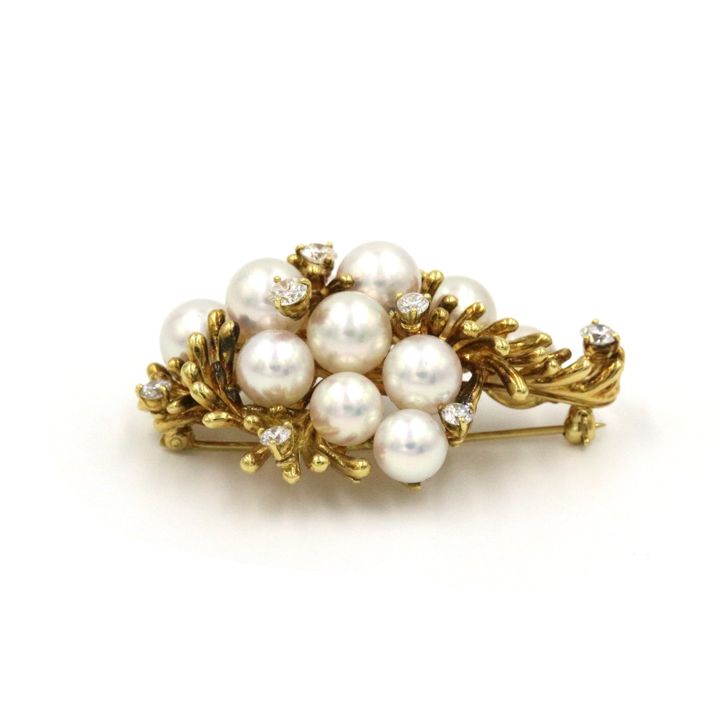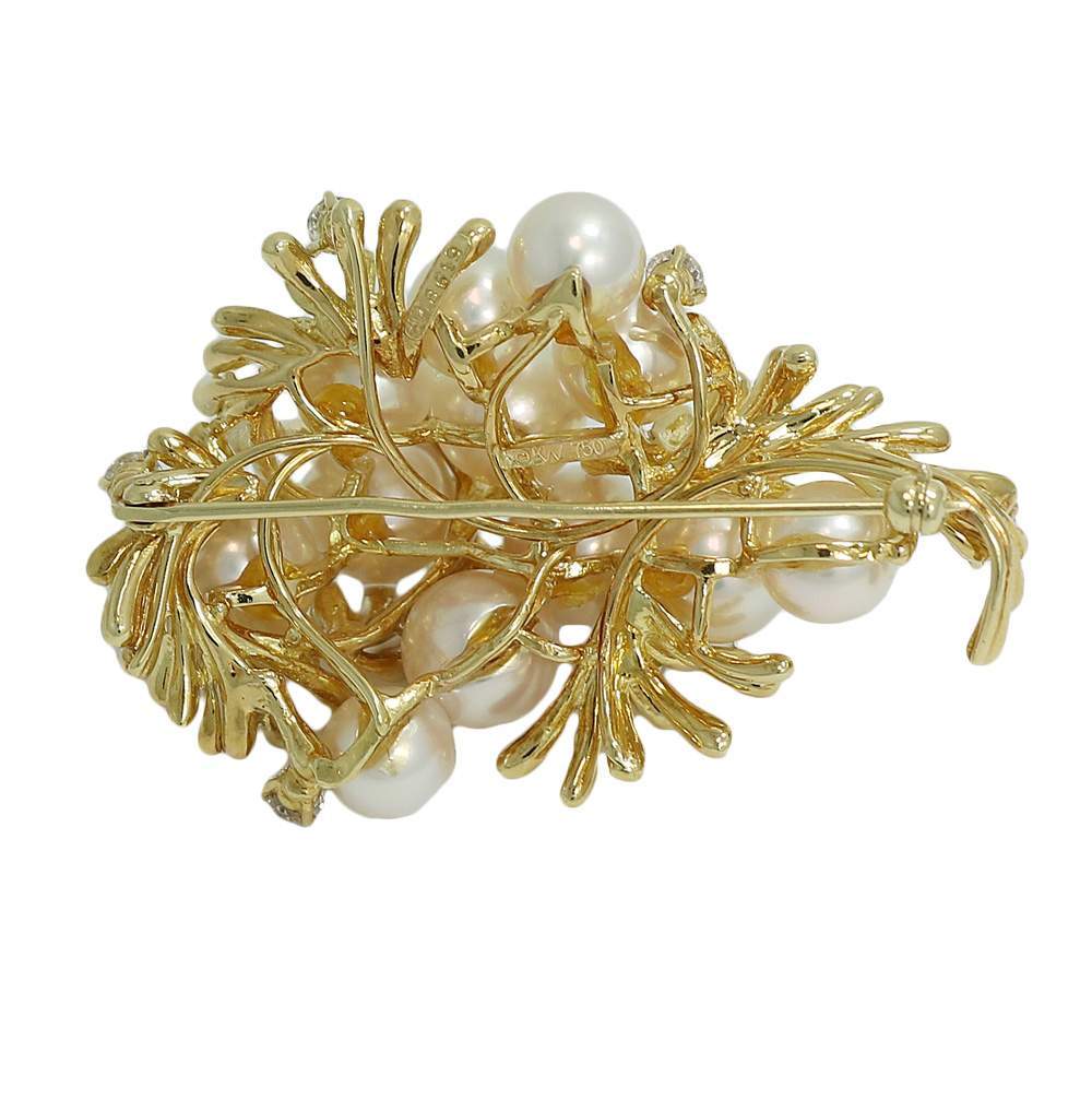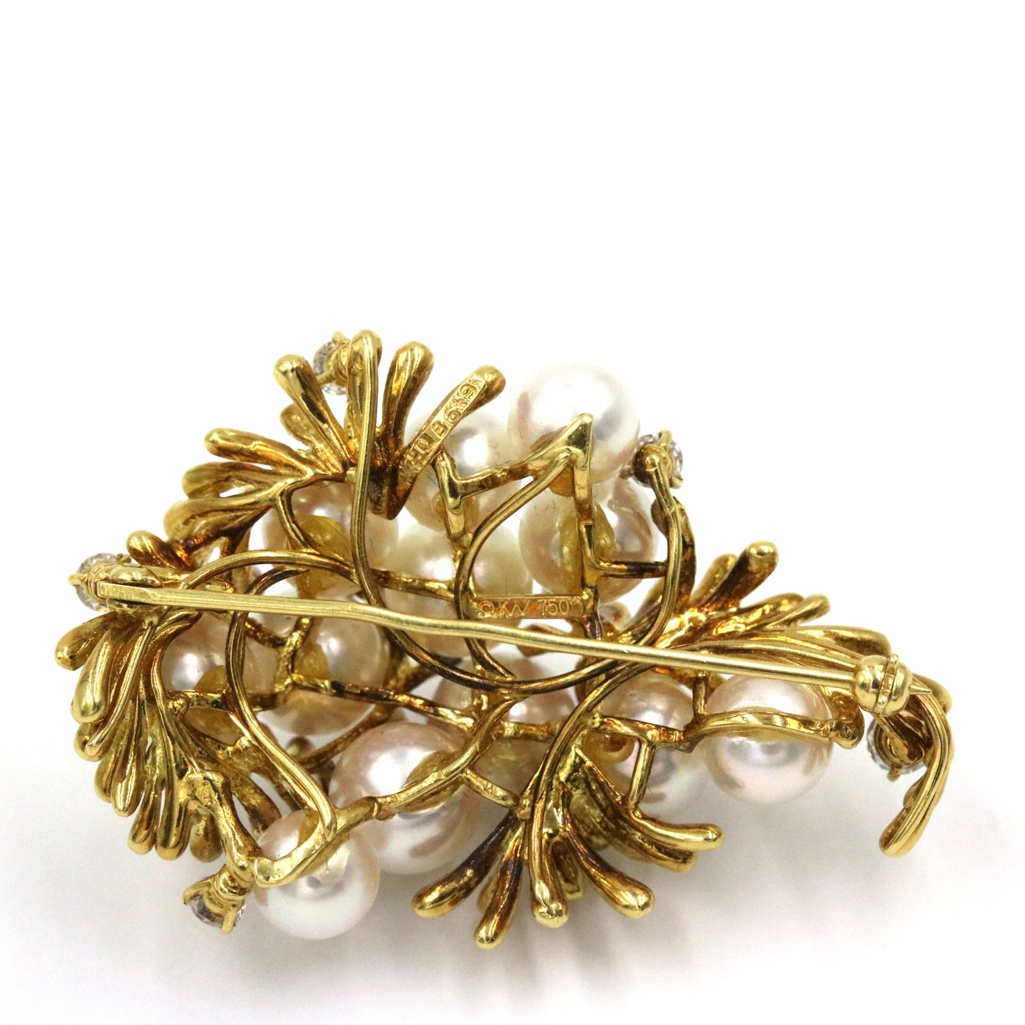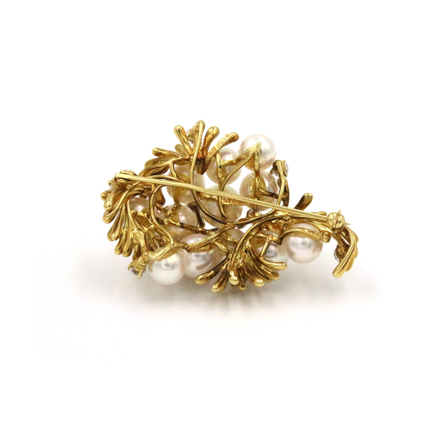 18 karat yellow gold Kurt Wayne brooch containing pearls surrounded by 1.20 carats of diamonds with H in color and VS in clarity.