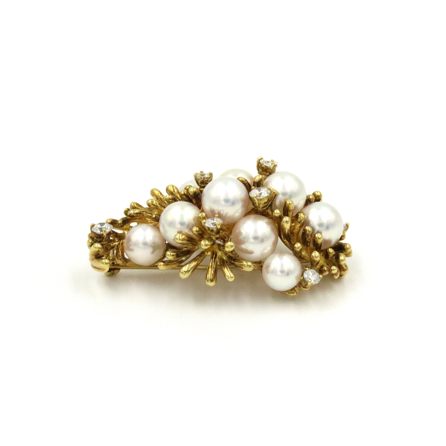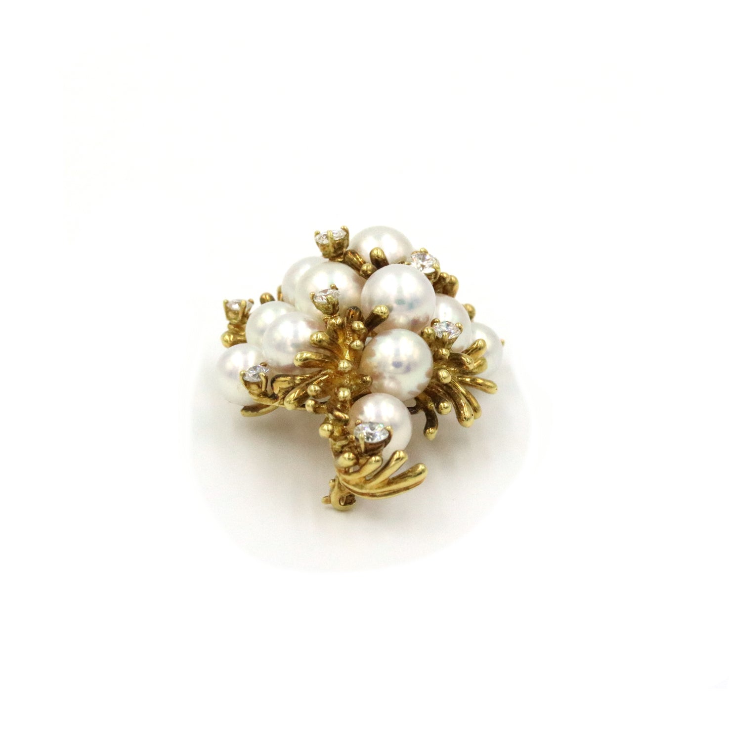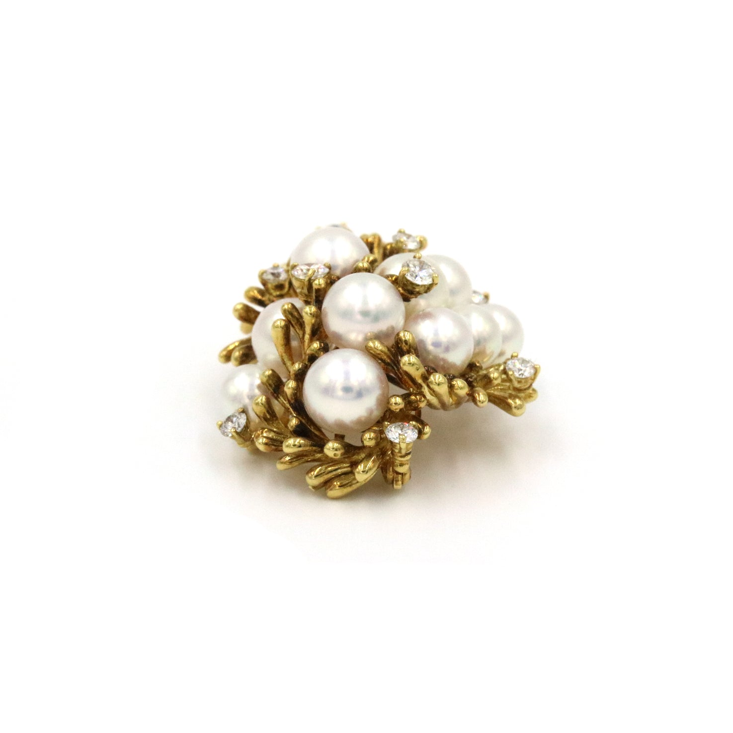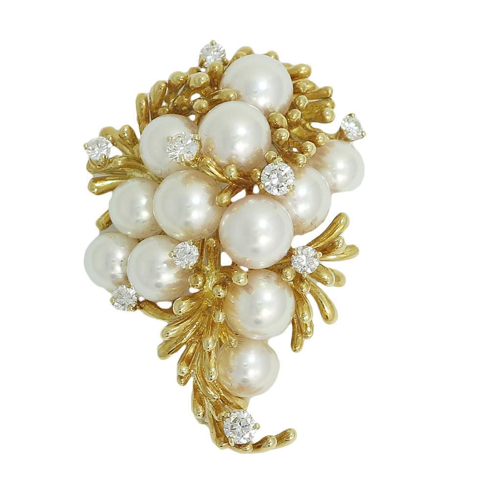 18 karat yellow gold Kurt Wayne brooch containing pearls surrounded by 1.20 carats of diamonds with H in color and VS in clarity.