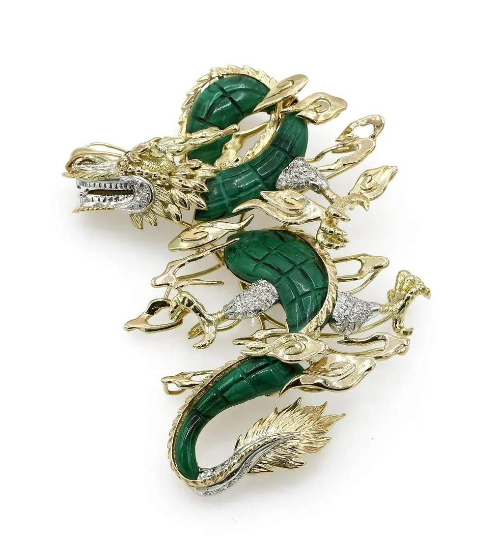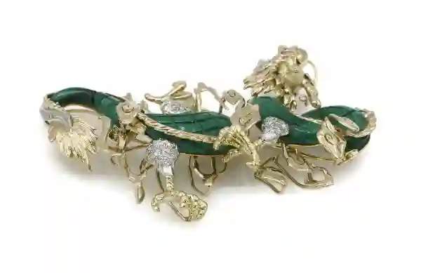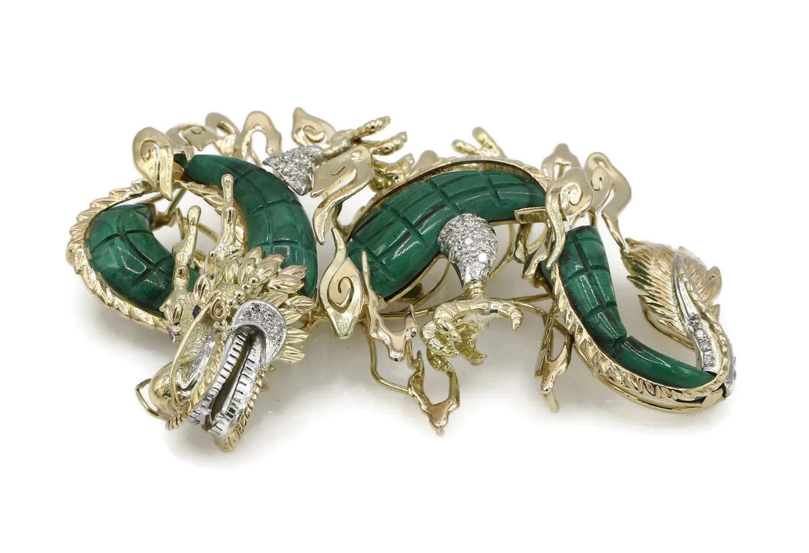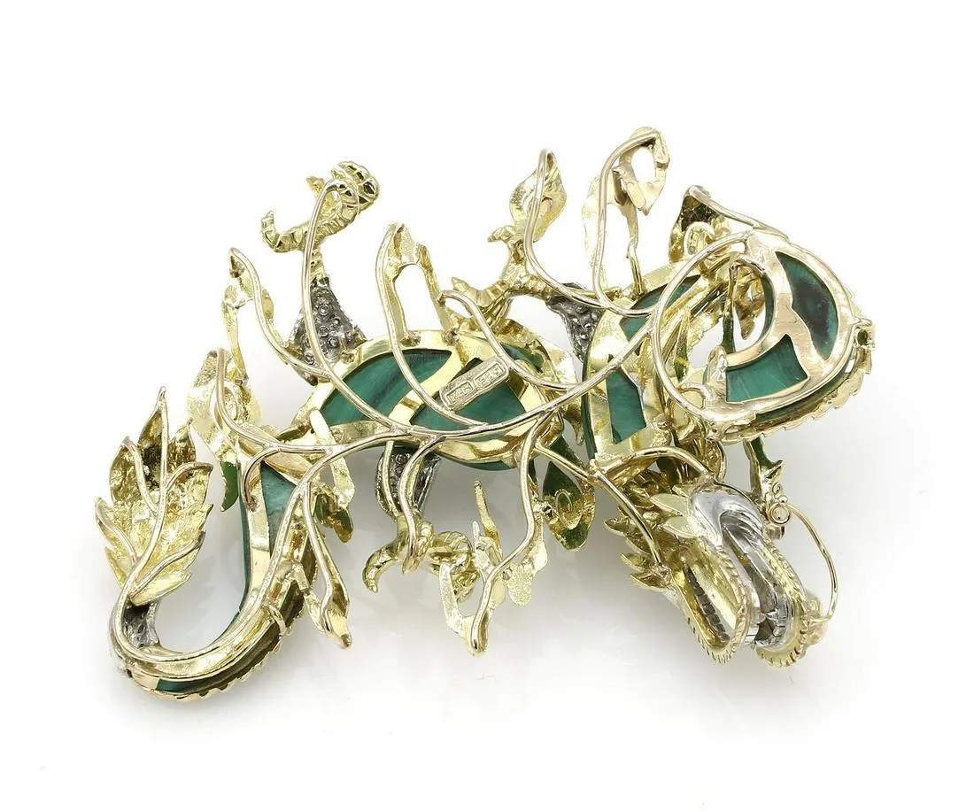 Brooch features Malachite and diamonds set in 14K yellow gold.