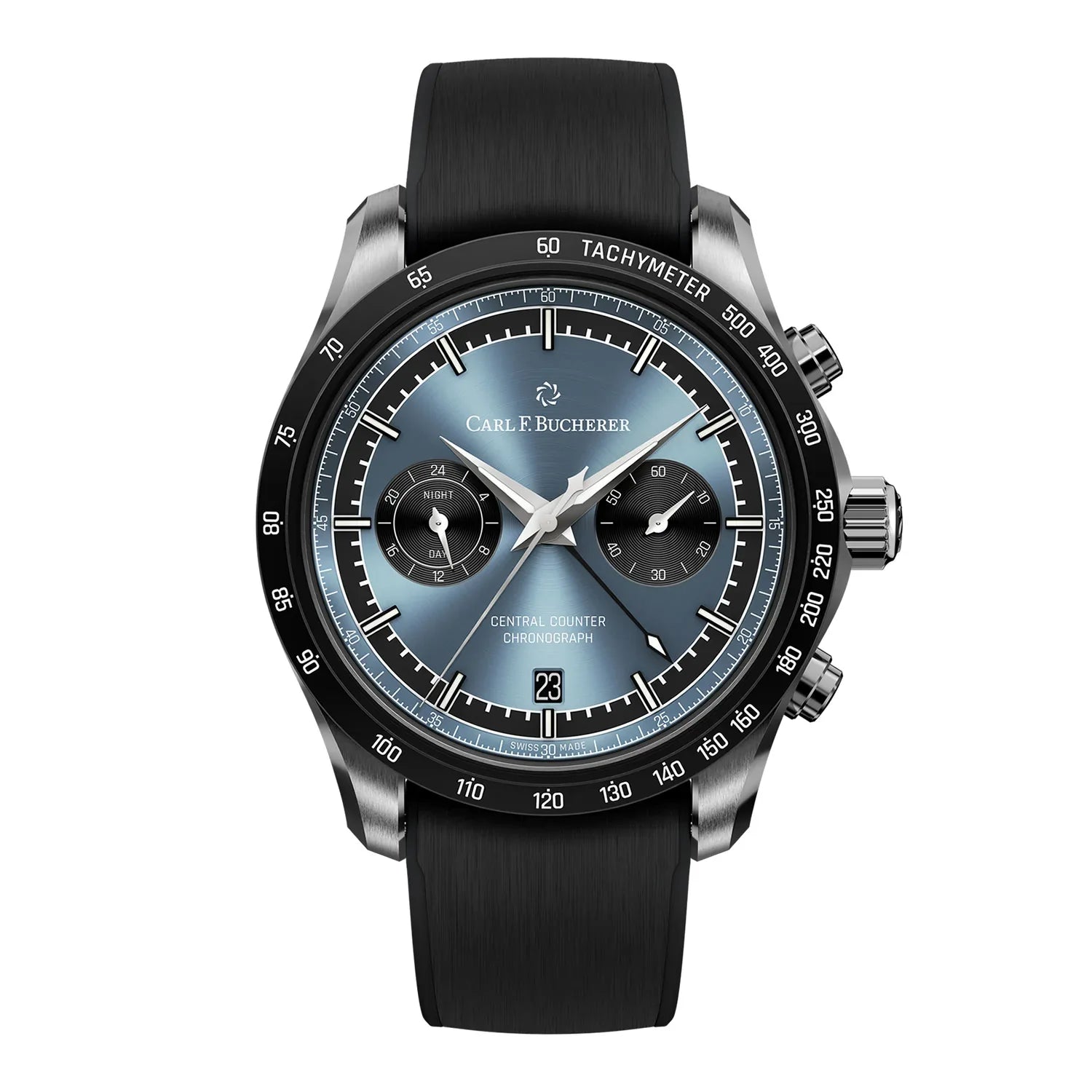 Stainless steel with DLC coated bezel automatic with chronograph with central minutes, small seconds, 24-hour day/night indication, date, round, 3atm, dial: blue with black sub dials index, rubber strap