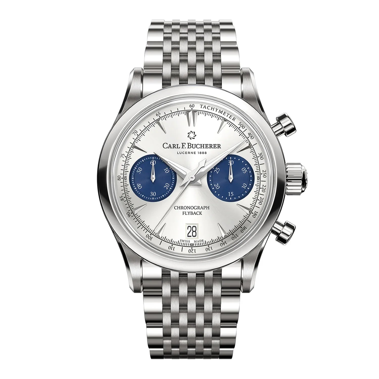 Stainless steel automatic with chronograph, flyback, date, small seconds, round, 3atm, dial: silver with blue sub dials index, stainless steel bracelet
