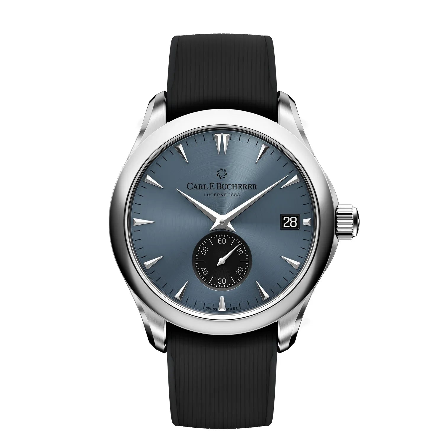Stainless steel automatic in-house caliber CFB A2050 with date, small seconds, COSC certified, round, 3atm, dial: blue with black sub dial index, rubber strap