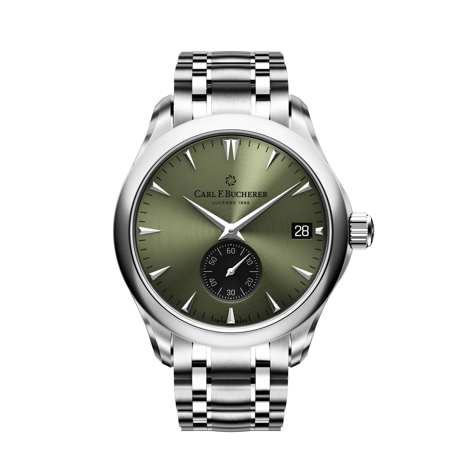 Stainless steel automatic in-house caliber CFB A2050 with date, small seconds, COSC certified, round, 3atm, dial: green with black sub dial index, stainless steel bracelet
