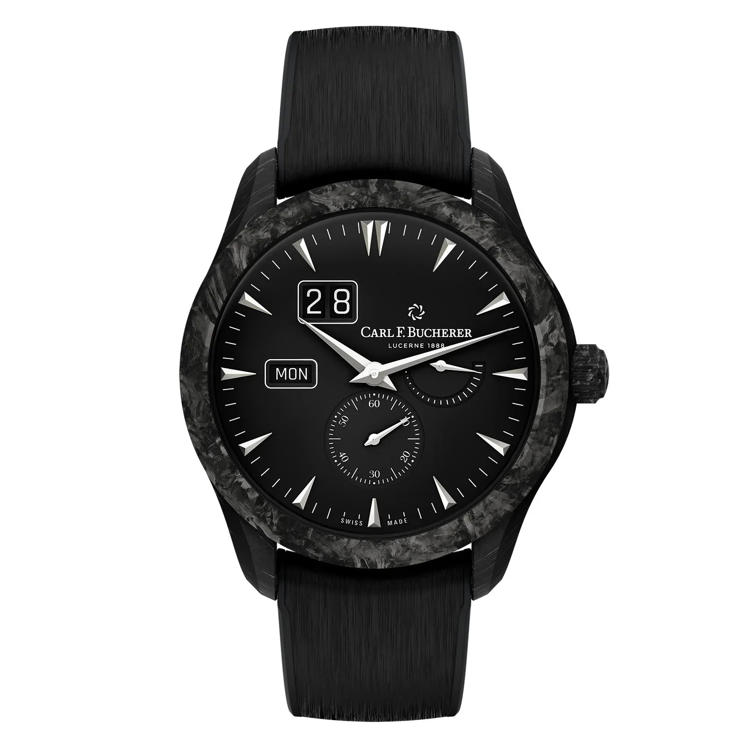 Forged carbon with titanium canister automatic in-house caliber CFB A2011 with power-reserve, day, date, small seconds, round, 3atm, dial: black index, rubber strap