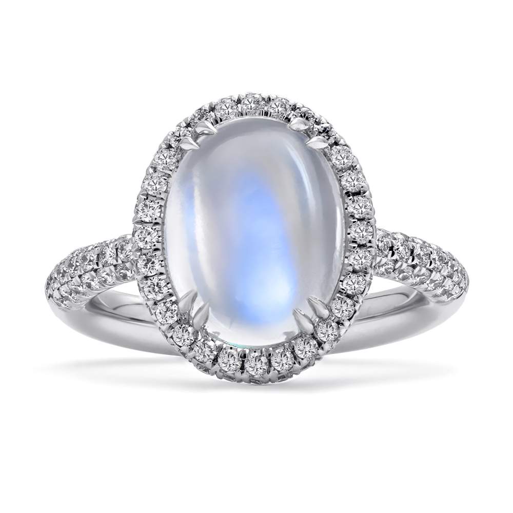 18 karat white gold Mark Henry fashion ring containing 5.64 carats of center moonstone surrounded by 0.73 carats total of diamonds.