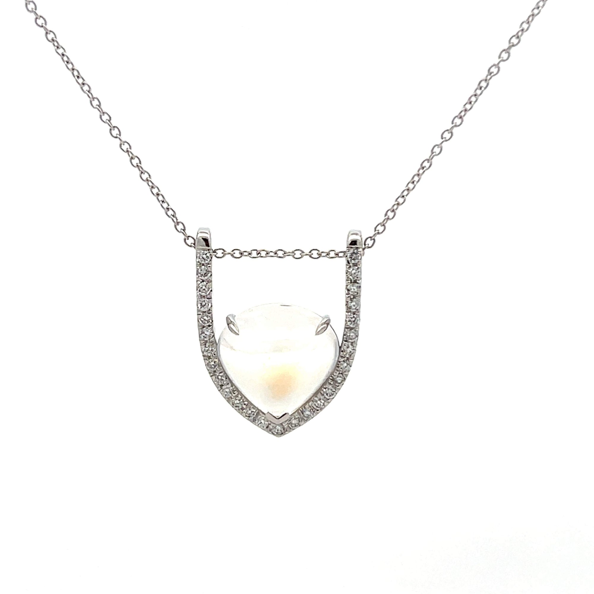 18 karat white gold Mark Henry Necklace containing 4.31 carats of a center moonstone surrounded by 0.20 carat total of diamonds.