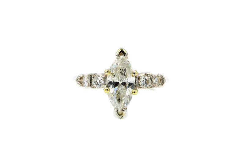Ring features a 1.05 marquise center Diamond, H color, I1 clarity and 4 Diamonds with a total weight of .15 carats set in Platinum.