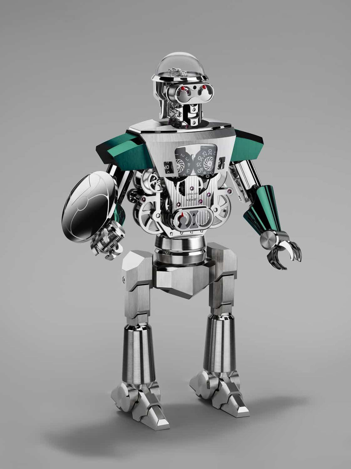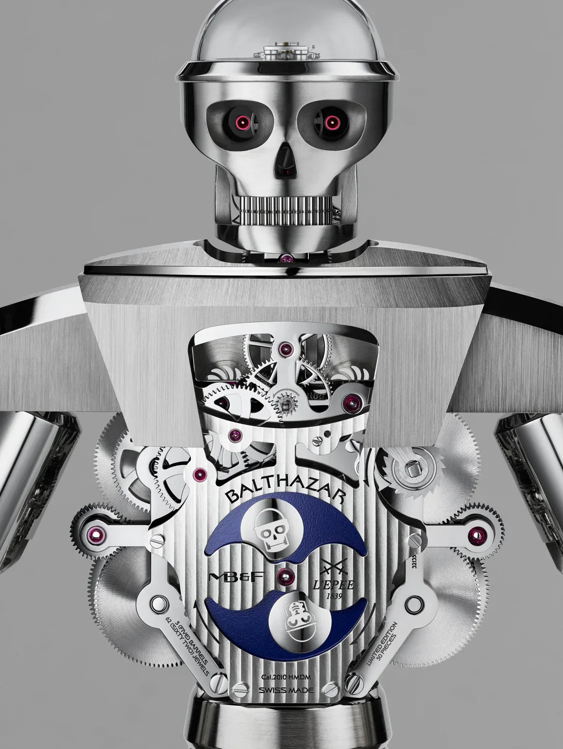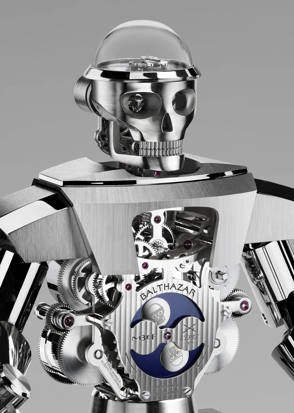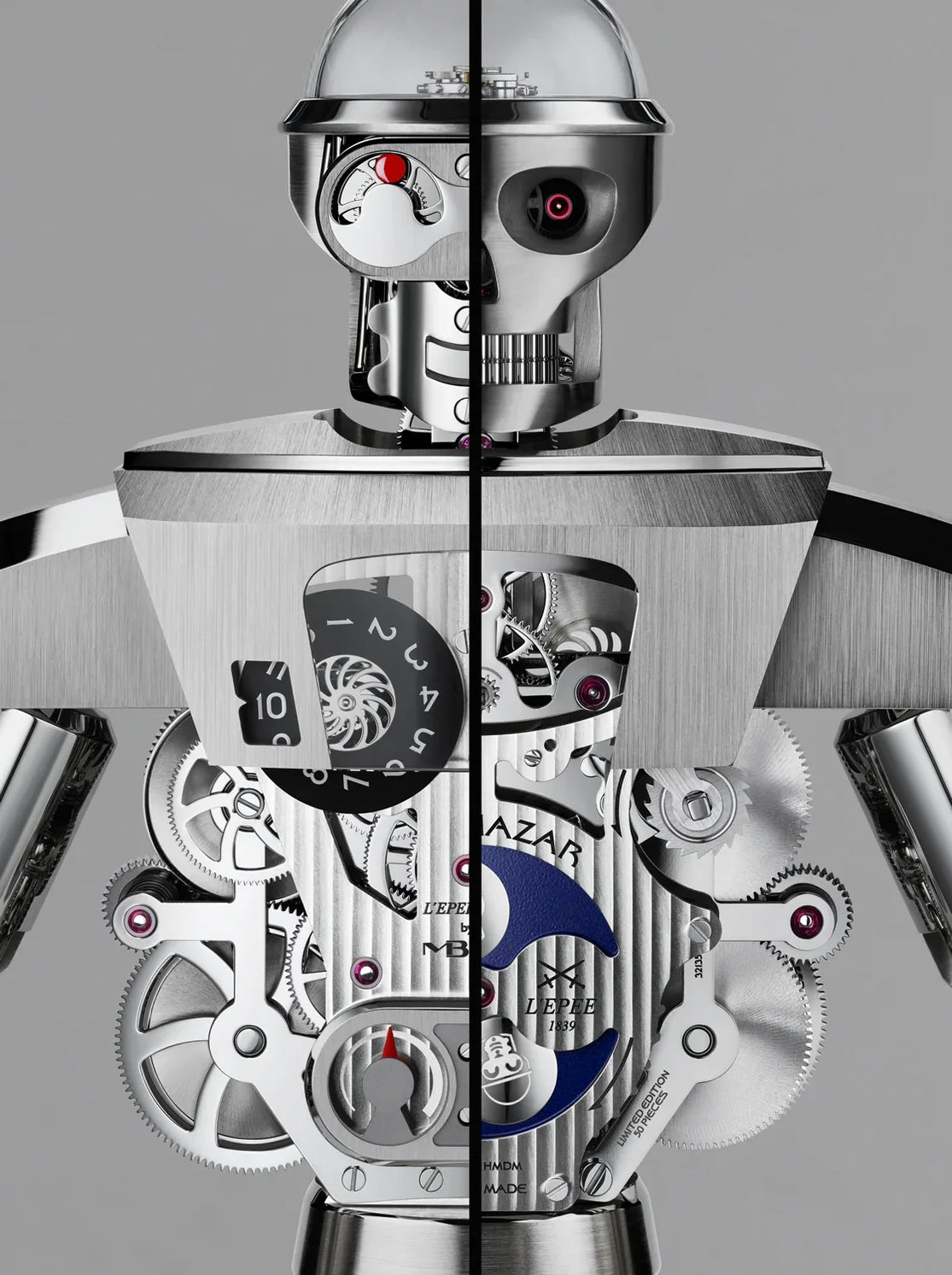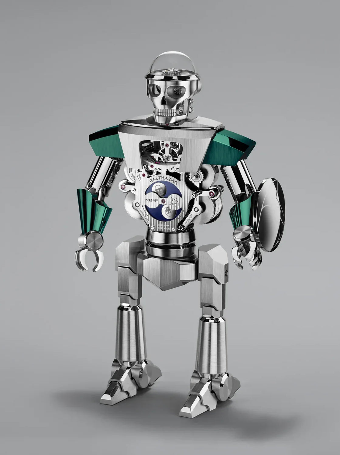 Weighing in at over 8 kilograms and standing 40 centimeters tall, Balthazar is a sophisticated and imposing high-precision robot clock composed of 618 beautifully finished, micro-engineered components. But beware… Balthazar hides two sides, as there are in all of us.