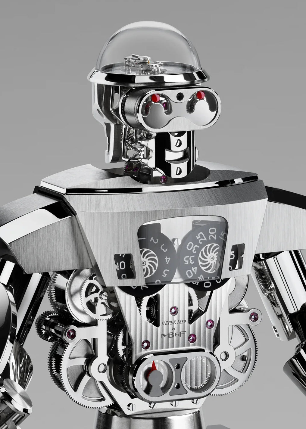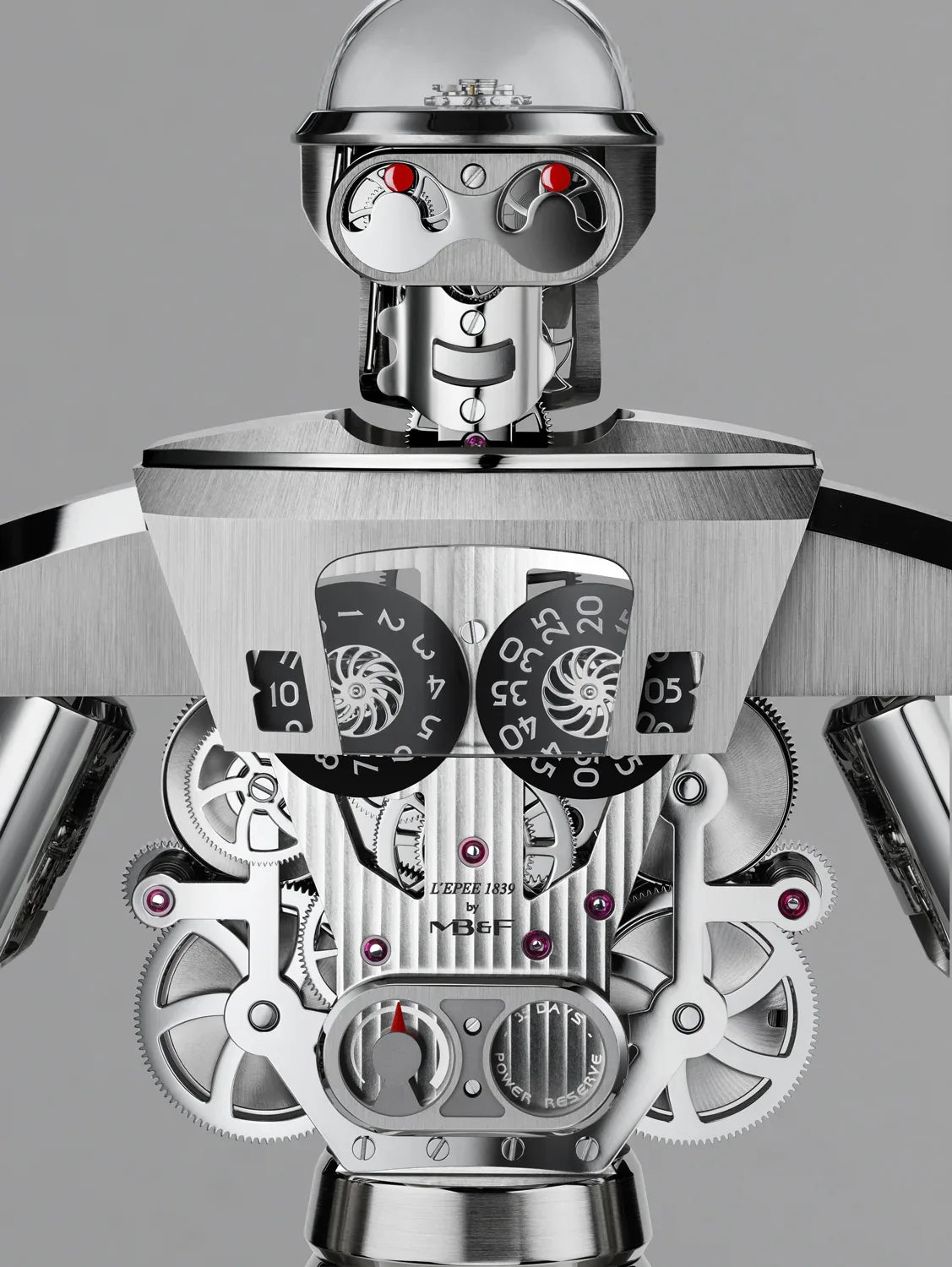 Light side: boasting 35 days of power reserve, Balthazar's clockwork displays "slow" jumping hours and sweeping minutes via two discs on the chest, while the power reserve is indicated on his belly. His red eyes, which continually scan the surroundings, are actually 20-second retrograde displays.