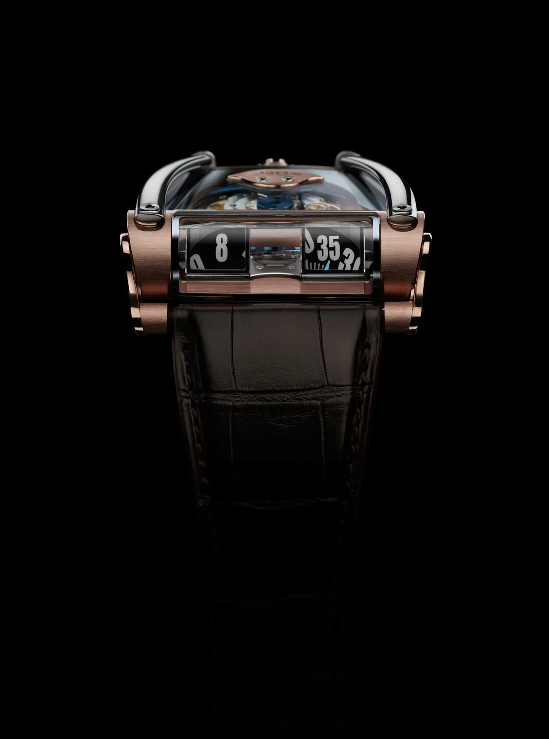 HM8's Engine sits in full view under nearly invisible sapphire crystal engine cover. The open center of the battle-axe rotor enables appreciation of the circular wave finish on the movement, while the hours and minute indication discs are visible day and night in the corners.