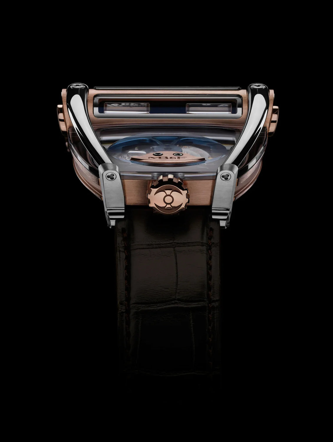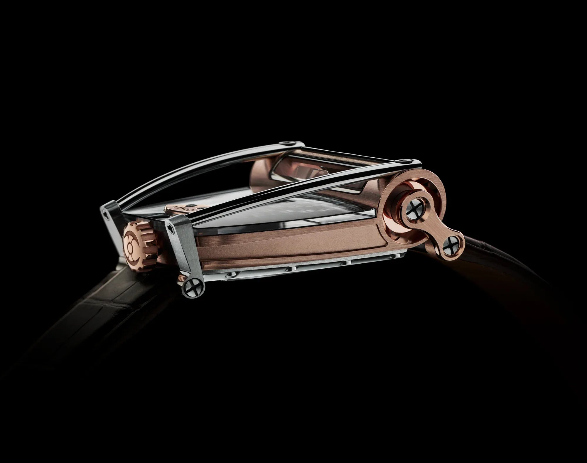 HM8 features a curvaceous yet angular case with dual optical prisms vertically displaying bi-directional jumping hours and minutes, while the distinctive battle-axe winding rotor is visible on top. But the real star of HM8 is its Can-Am inspired chrome "roll bars" majestically sweeping from the top of the front of the Machine down to the tapered back.
