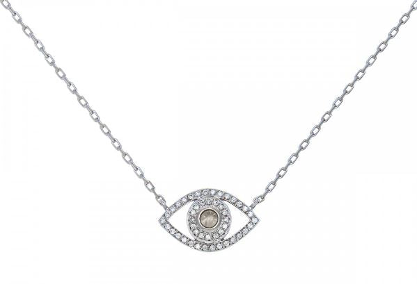 18 karat white gold Netali Nissim protected eye necklace containing 0.14 carat total of diamonds with center rose quartz cabochon.