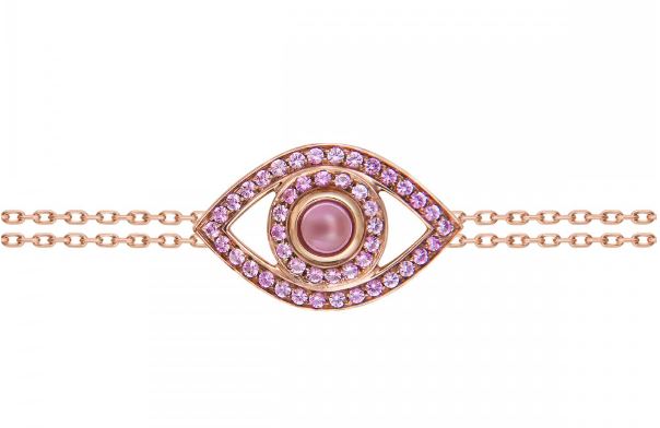 18 karat rose gold Netali Nissim Protected Eye bracelet containing 0.78 carats of pink sapphires surrounding a center cabochon quartz.