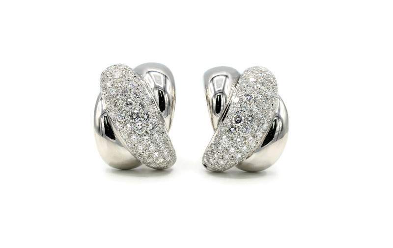 Earrings feature 146 pave set diamonds with a total weight of 3.77 carats, H-I color, VS-SI clarity, set in 18K white gold.