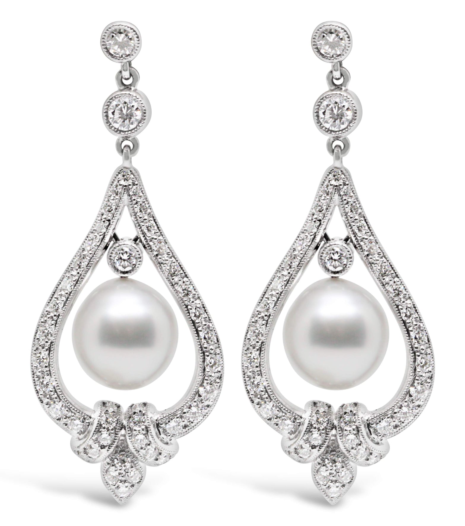 Dangle Pearl and Diamond earrings set in platinum featuring South Sea pearls and total diamond weight approx. 2.25 carats