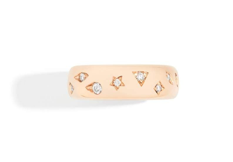 18 karat rose gold Pomellato Iconica ring with fancy setting diamonds. In a size medium.