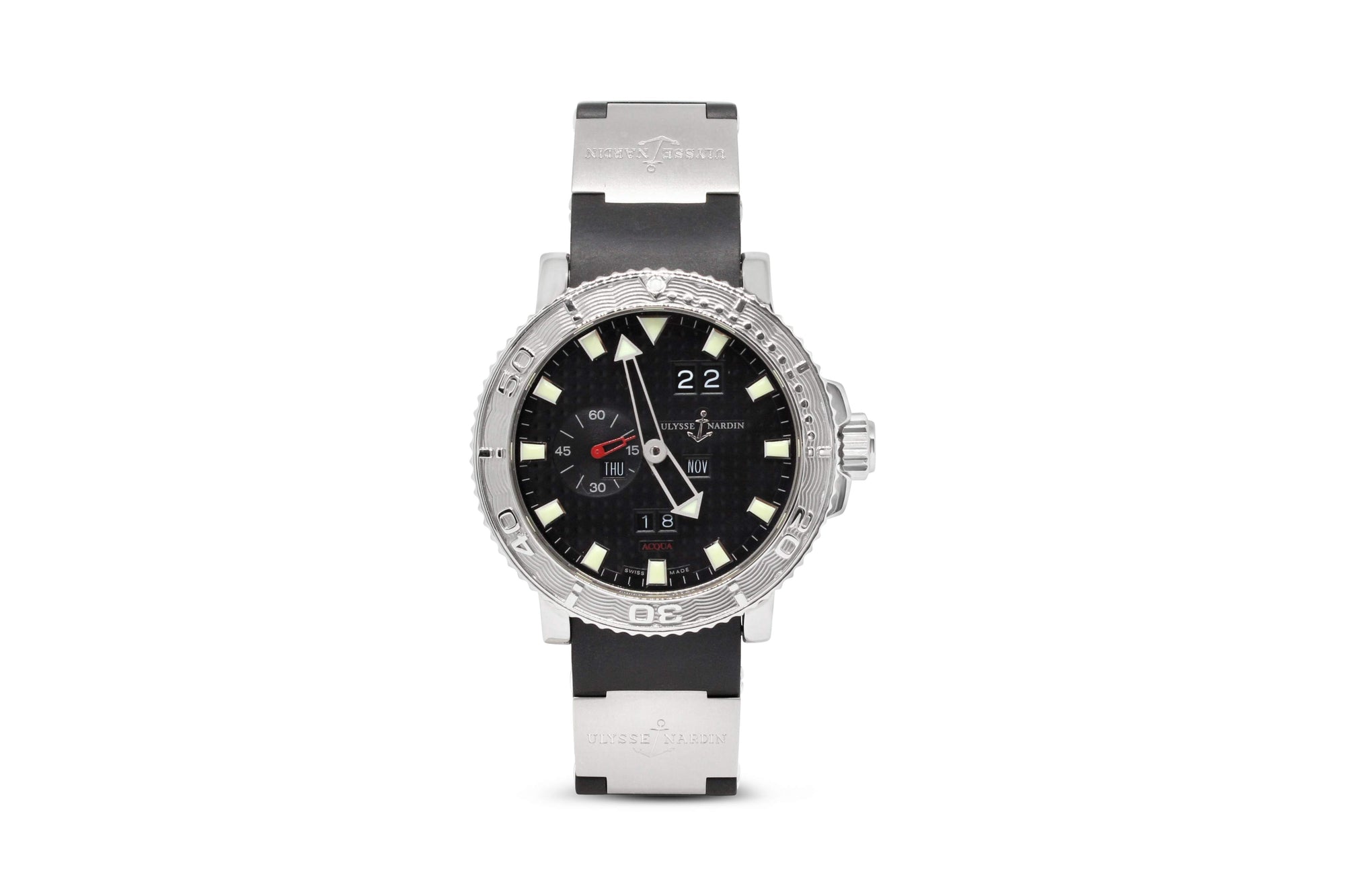 A Pre-Owned Stainless Steel Ulysse Nardin Acqua Perpetual Watch. The Watch Features A Black Dimpled Dial, A Day, Date & Month Window, A Rubber Strap With A Deployant Buckle And Box- Papers.