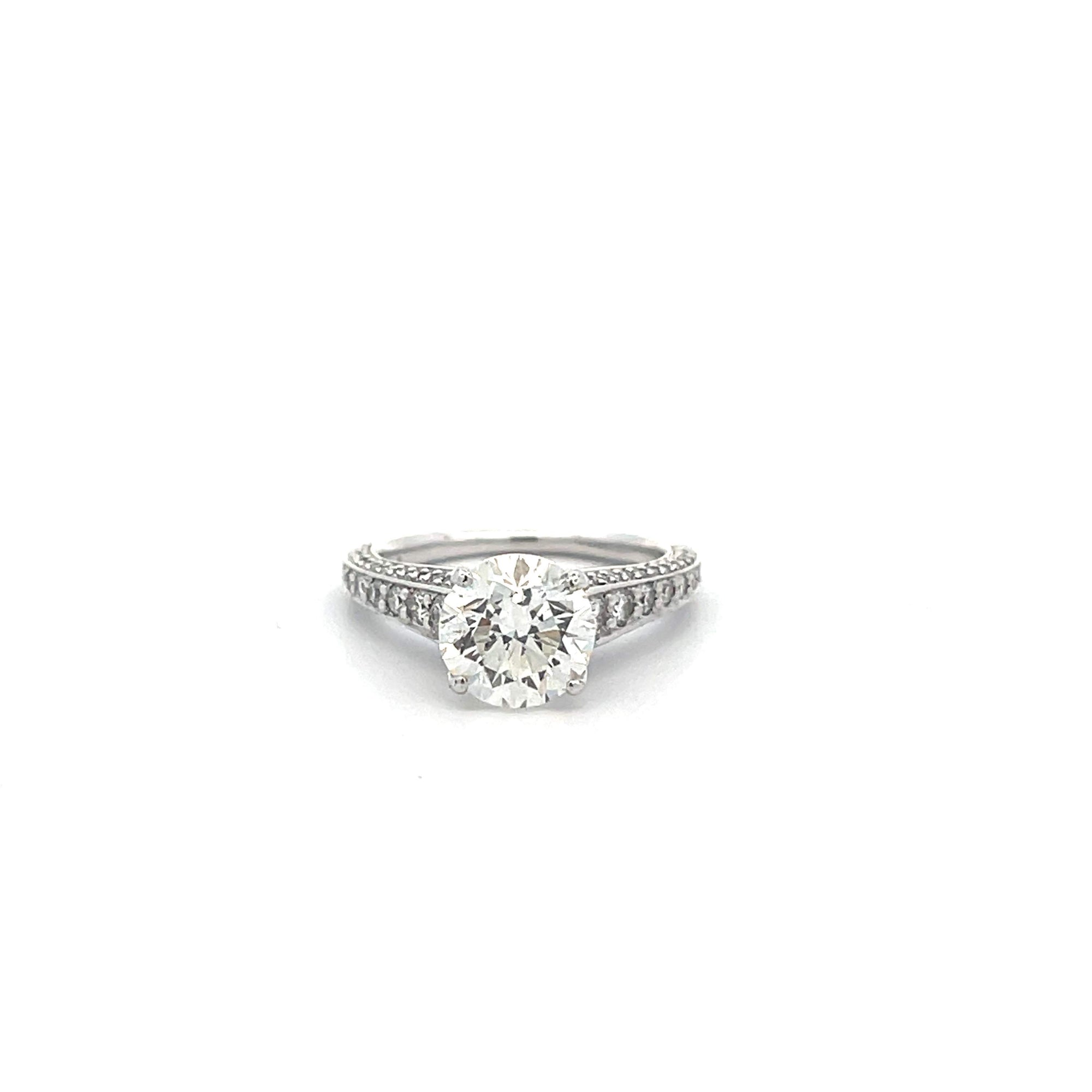 18 karat white gold Ritani engagement ring containing 0.44 carats of a center round brilliant diamond with G-H in color and VS in clarity surrounded by 2.01 carat total of diamonds with I in color and SI1 in clarity.