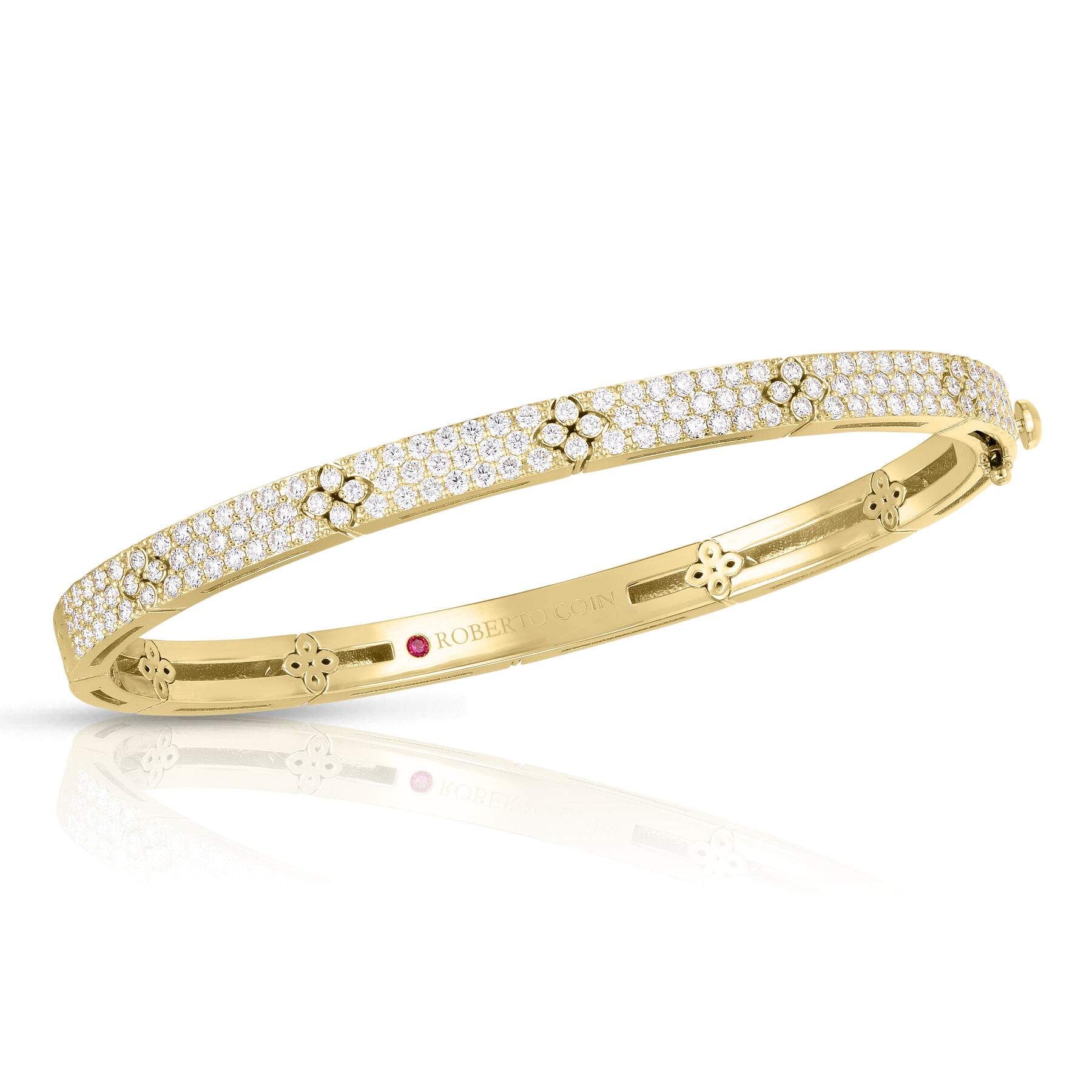 18 karat yellow gold Roberto Coin Love In Verona Pave Bangle containing 1.70 carat total of diamonds.