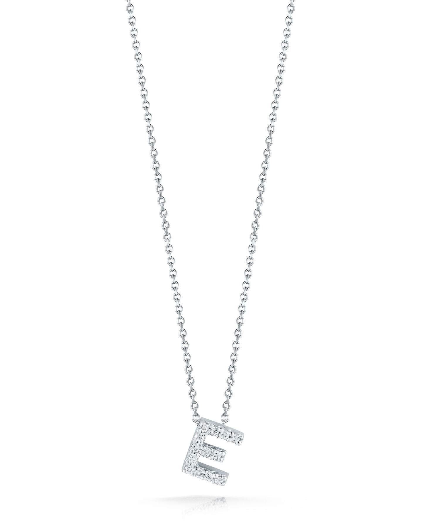 18 karat white gold Roberto Coin Tiny Treasure Love Letter "E" Pendant Necklace containing 0.06 carat total of diamonds.