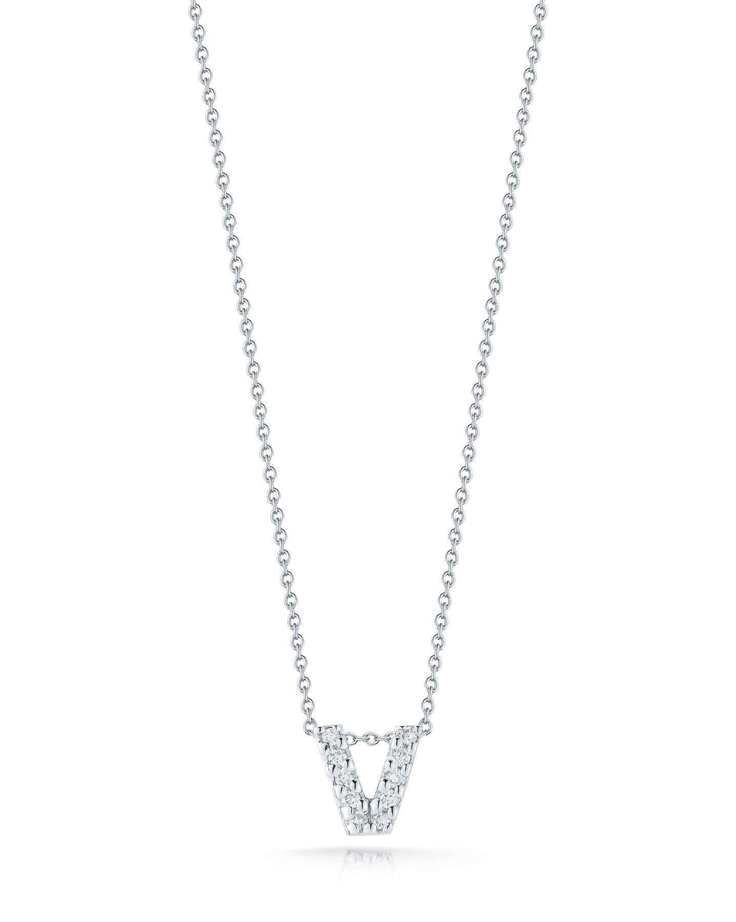 18 karat white gold Roberto Coin Tiny Treasure Love Letter "V" Pendant Necklace containing 0.05 carat total of diamonds.