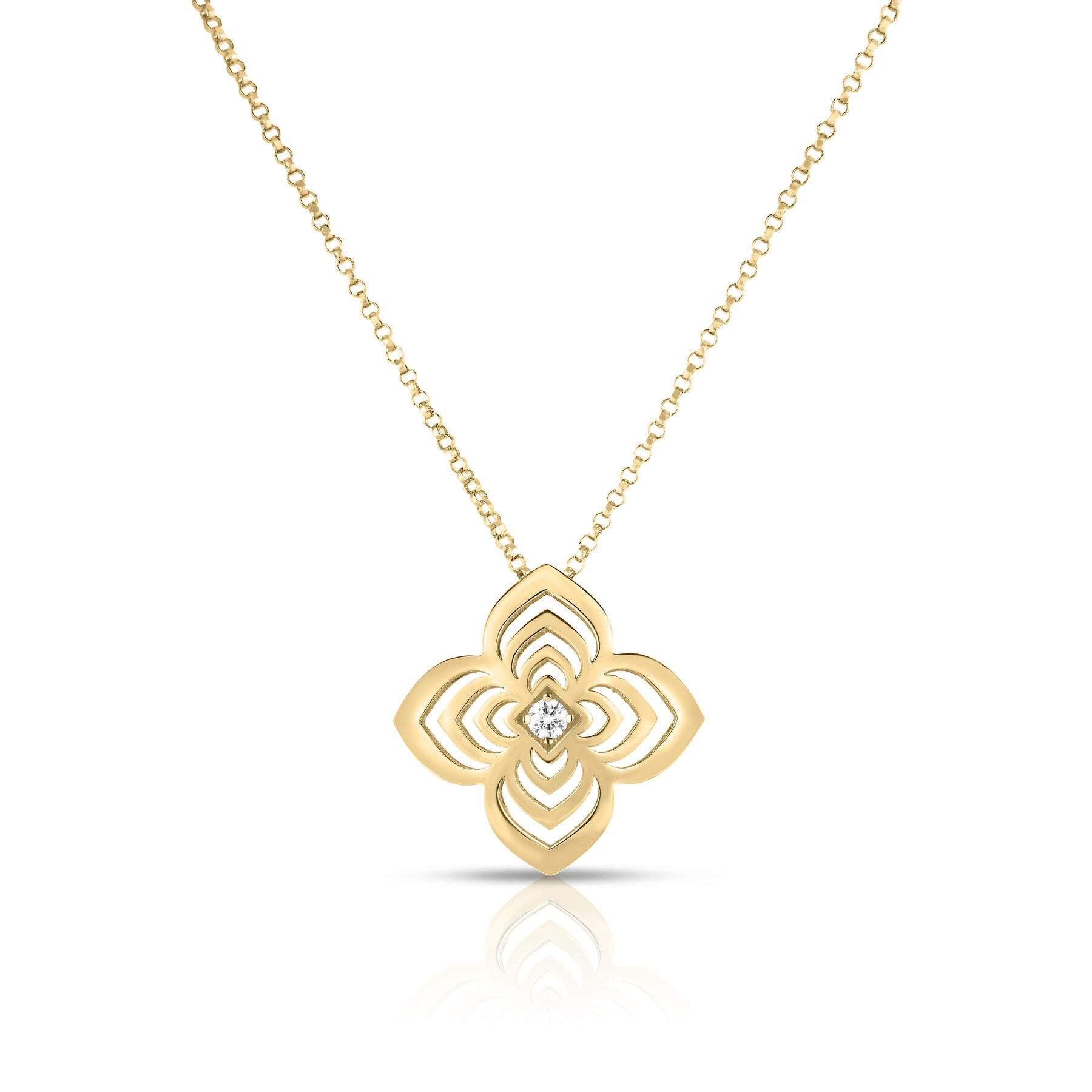 18 karat yellow gold Roberto Coin Palazzo Ducale Carnival Flower Necklace containing 0.04 carats of a center round diamond.
