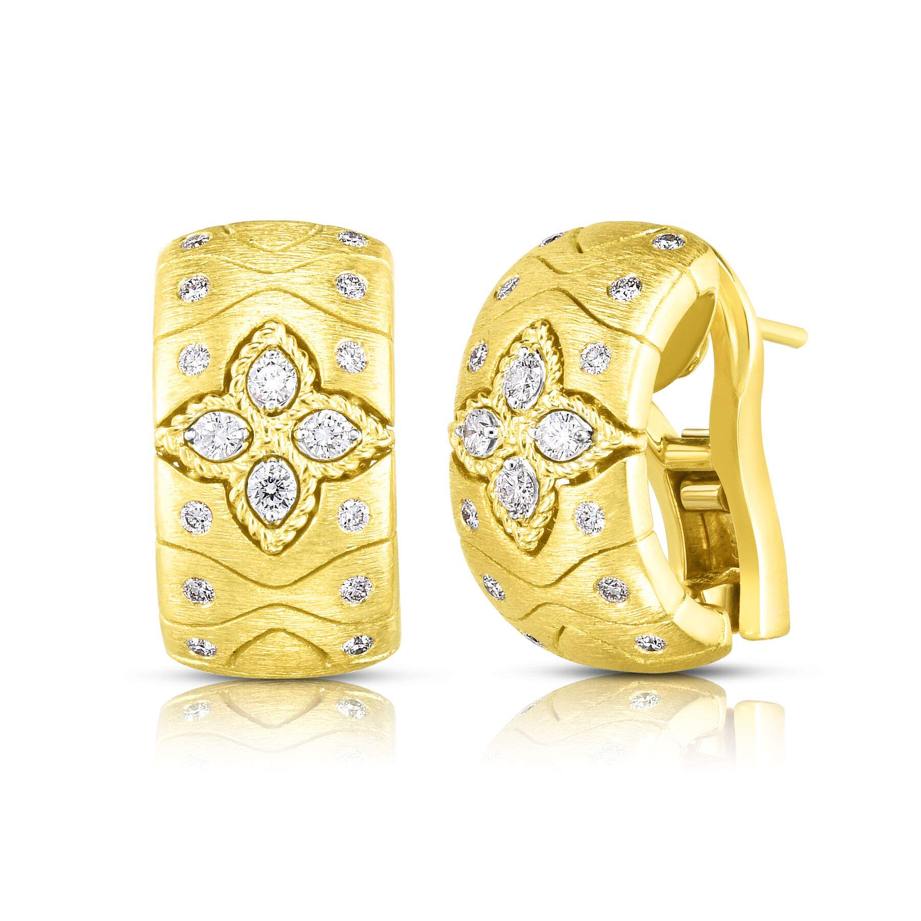 18 karat yellow gold Roberto Coin Royal Princess Flower Satin-Finish Earrings containing 0.44 carat total of diamonds.