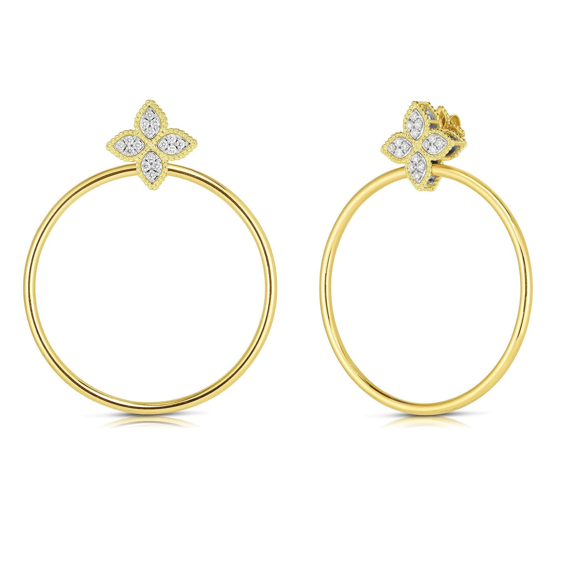 18 karat yellow gold Roberto Coin Princess Flower Attached Hoop Earrings containing 0.35 carat total of diamonds.